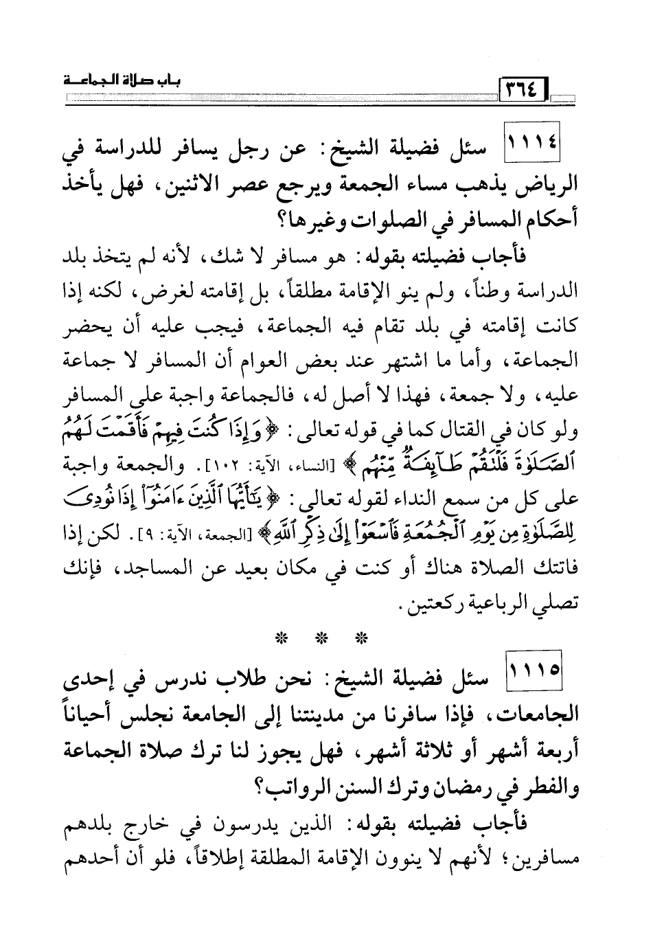 فأجب فضيلته بقوله: هو مسافر لا شك, لأنه يتخذ الدراسة وطناً, ولم ينو الإقامة مطلقاً, بل إقامته لغرض, ولكنه إذا كانت إقامته في بلد تقام فيه الجماعة, فيجب عليه أن يحضر الجماعة, وأما ما اشتهر عند بعض العوام أن المسافر لا جماعة، ولا جمعة، فهذا لا أصل له، فالجماعة واجبة على المسافر ولو كان في القتال كما في قوله تعالى (وَإِذَا كُنْتَ فِيهِمْ فَأَقَمْتَ لَهُمُ الصَّلاةَ فَلْتَقُمْ طَائِفَةٌ مِنْهُمْ) (النساء: من الآية102) . والجمعة واجبة على كل من سمع النداء لقوله تعالى: (يَا أَيُّهَا الَّذِينَ آمَنُوا إِذَا نُودِيَ لِلصَّلاةِ مِنْ يَوْمِ الْجُمُعَةِ فَاسَعَوْا إِلَى ذِكْرِ اللَّهِ) (الجمعة: من الآية9) . لكن إذا فاتتك الصلاة هناك أو كنت في مكان بعيد عن المساجد، فإنك تصلي الرباعية ركعتين.