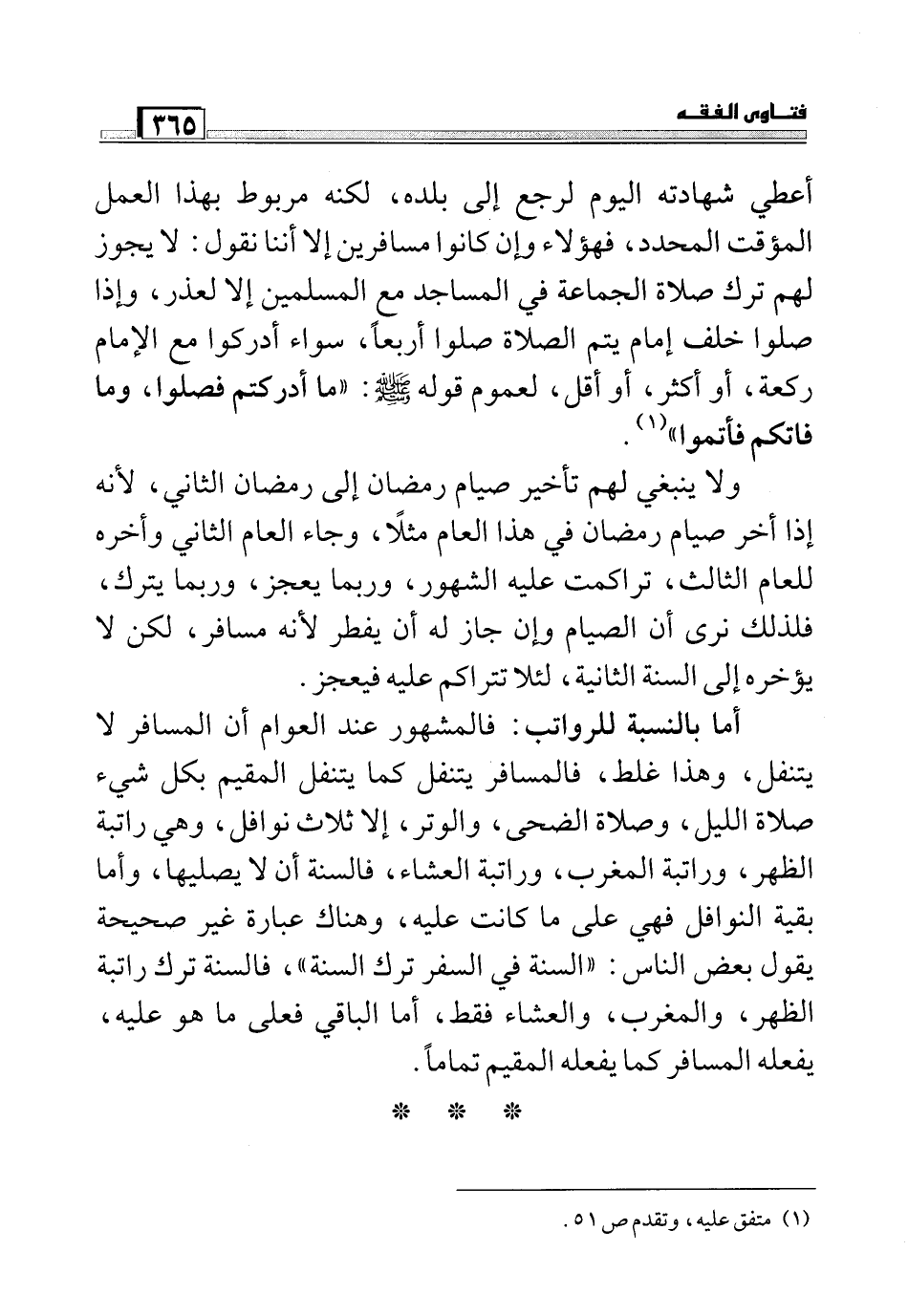 أعطي شهادته اليوم لرجع إلى بلده، لأنه مربوط بهذا العمل المؤقت المحدد، فهؤلاء وإن كانوا مسافرين إلا أننا نقول لا يجوز لهم ترك صلاة الجماعة في المساجد مع المسلمين إلا لعذر، وإذا صلوا خلف إمام يتم الصلاة صلوا أربعاً، سواء أدركوا مع الإمام ركعة، أو أكثر، أو أقل، لعموم قوله صلي الله عليه وسلم: ((ما أدركتم فصلوا، وما فاتكم فأتموا) (1) .