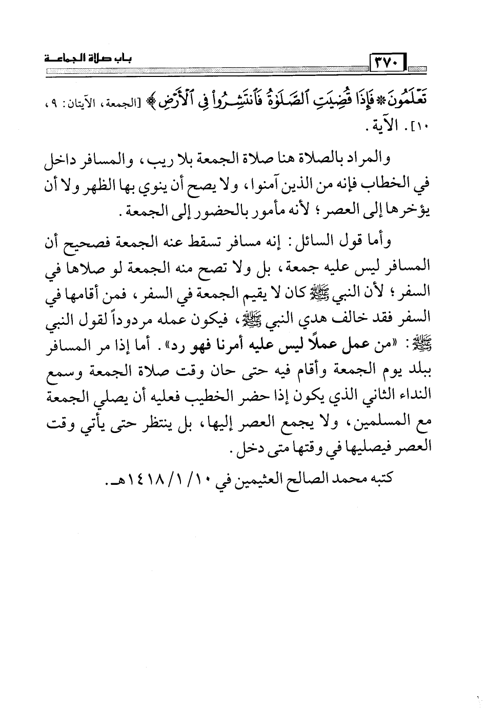 والمراد بالصلاة هنا صلاة الجمعة بلا ريب, والمسافر داخل في الخطاب فإنه من الذين آمنوا, ولا يصح أن ينوي بها الظهر ولا أن يؤخرها إلى العصر؛ لأنه مأمور بالحضور إلى الجمعة.