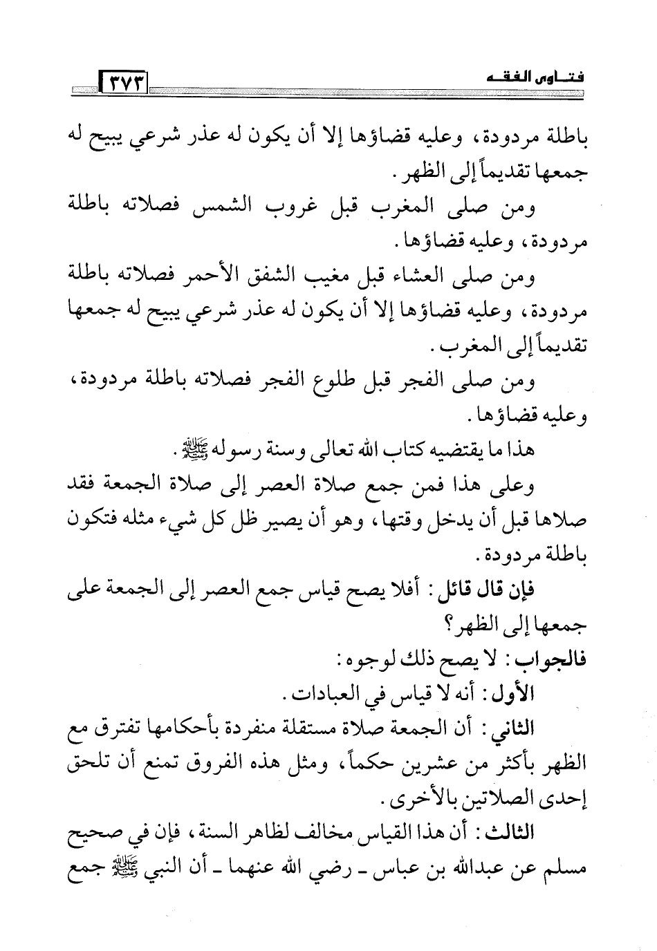 ومن صلى الفجر قبل طلوع الفجر فصلاته مردودة, وعليه قضاؤها. هذا ما تقتضيه كتاب الله تعالى وسنة رسوله صلي الله عليه وسلم.وعلى هذا فمن جمع صلاة العصر إلى صلاة الجمعة فقد صلاها قبل أن يدخل وقتها ,وهو أن يصير ظل كل شيء مثله فتكون باطلة مردودة. فإن قال قائل: أفلا يصح قياس جمع العصر إلى الجمعة على جمعها إلى الظهر؟