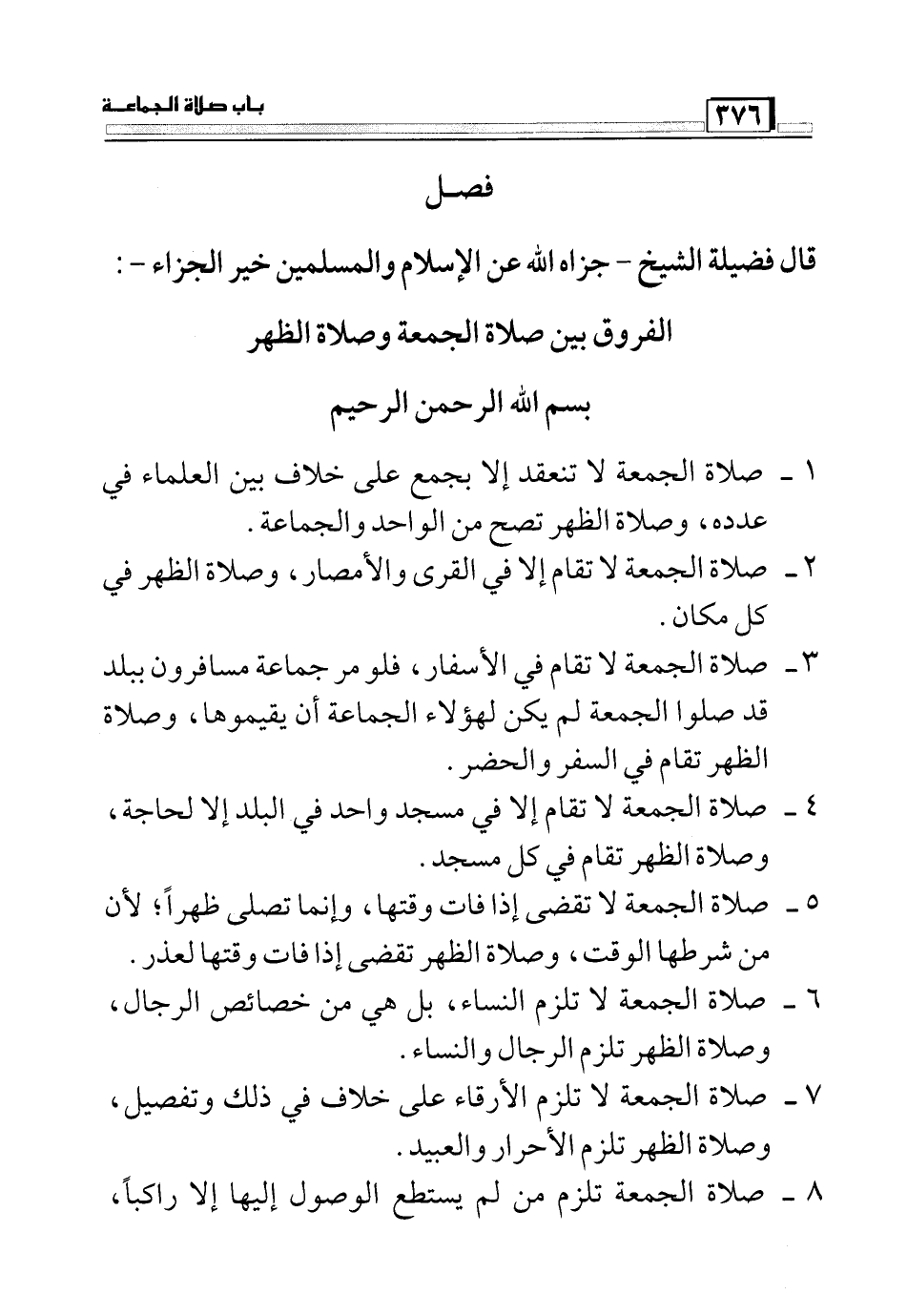 7- صلاة الجمعة لا تلزم الأرقاء على خلاف في ذلك وتفصيل, وصلاة الظهر تلزم الأحرار والعبيد.