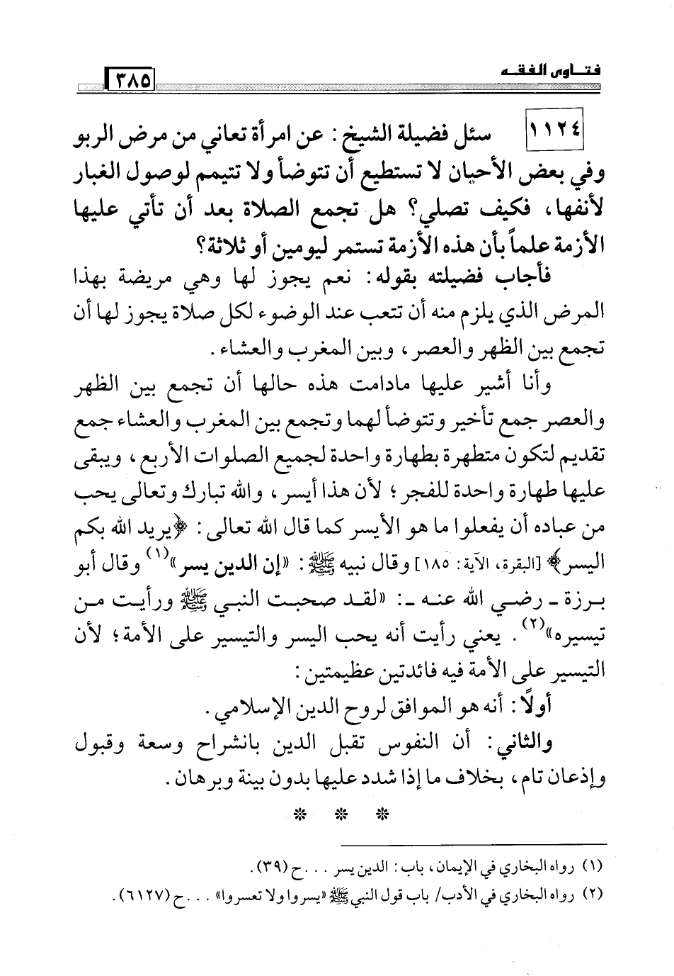 فأجاب فضيلته بقوله: نعم يجوز لها وهي مريضة بهذا المرض الذي يلزم منه أن تتعب عند الوضوء لكل صلاة يجوز لها أن تجمع بين الظهر والعصر, وبين المغرب والعشاء وأنا أشير عليها ما دامت هذه حالها أن تجمع بين الظهر والعصر جمع تأخير وتتوضأ لهما وتجمع بين المغرب والعشاء جمع تقديم لتكون متطهرة بطهارة واحدة لجميع الصلوات الأربع, ويبقى عليها طهارة واحدة للفجر؛ لأن هذا أيسر, والله تبارك وتعالى يحب من عباده أن يفعلوا ما هو الأيسر كما قال الله تعالى: (يُرِيدُ اللَّهُ بِكُمُ الْيُسْر) (البقرة: من الآية185) وقال نبيه صلي الله عليه وسلم (إن الدين يسر) (1) وقال أبو برزة – رضي الله عنه - (لقد صحبت النبي صلي الله عليه وسلم ورأيت من تيسيره) (2) .يعني رأيت أنه يحب اليسر والتيسير على الأمة؛ لأن التيسير على الأمة فيه فائدتين عظيمتين:
