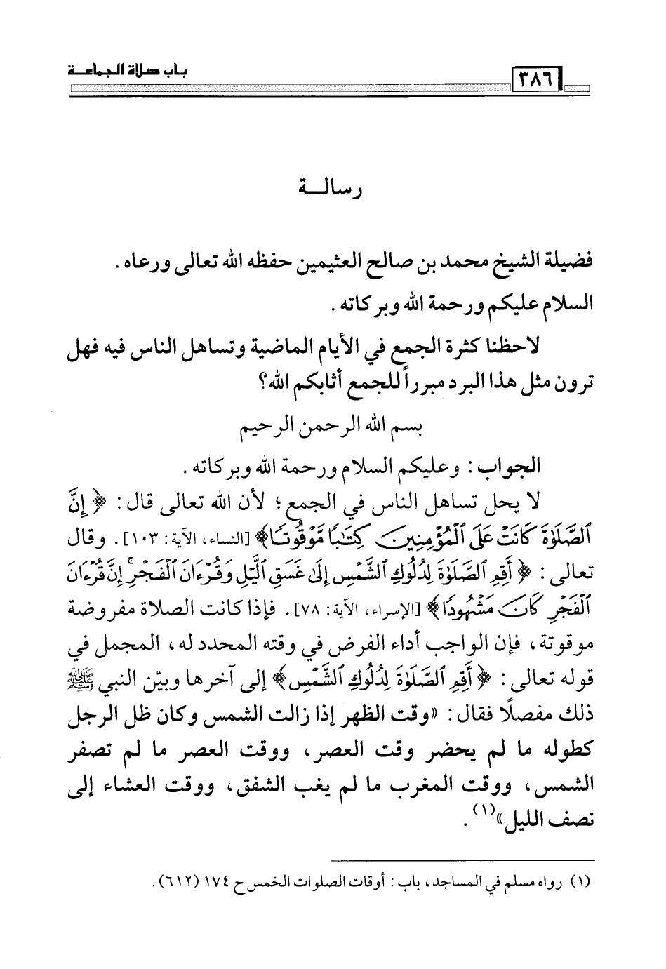 لا يحل تساهل الناس في الجمع؛ لأن الله تعالى قال: (إِنَّ الصَّلاةَ كَانَتْ عَلَى الْمُؤْمِنِينَ كِتَاباً مَوْقُوتاً) (النساء: من الآية103) . وقال تعالى: (أَقِمِ الصَّلاةَ لِدُلُوكِ الشَّمْسِ إِلَى غَسَقِ اللَّيْلِ وَقُرْآنَ الْفَجْرِ إِنَّ قُرْآنَ الْفَجْرِ كَانَ مَشْهُوداً) (الإسراء:78) . فإذا كانت الصلاة مفروضة موقوتة، فإن الواجب أداء الفرض في وقته المحدد له، المجمل في قوله تعالى: (أَقِمِ الصَّلاةَ لِدُلُوكِ الشَّمْسِ) إلى آخرها وبين النبي صلي الله عليه وسلم ذلك مفصلاً فقال: ((وقت الظهر إذا زالت الشمس وكان ظل الرجل طوله ما لم يحضر وقت العصر، ووقت العصر ما لم تصفر الشمس، ووقت المغرب ما لم يغب الشفق، ووقت العشاء إلى نصف الليل) (1) .