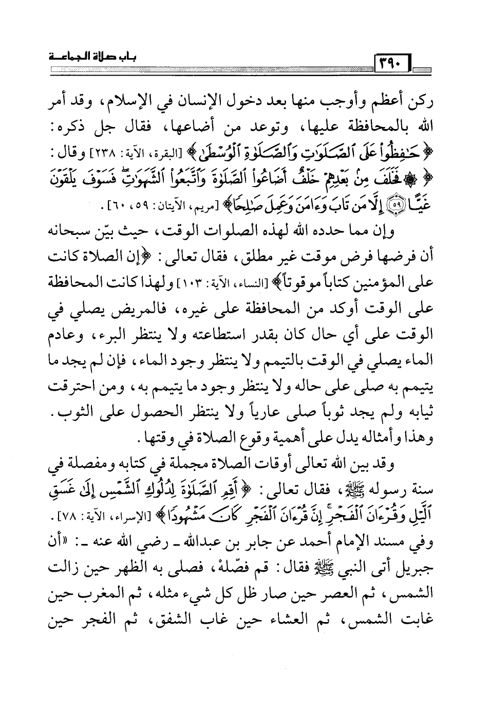 وإن مما حده لله لهذه الصلوات الوقت، حيث بيّن سبحانه أن فرضها فرض موقت غير مطلق، فقال تعالى: (إِنَّ الصَّلاةَ كَانَتْ عَلَى الْمُؤْمِنِينَ كِتَاباً مَوْقُوتاً) (النساء: من الآية103) ولهذا كانت المحافظة على الوقت أوكد من المحافظة على غيره، فالمريض يصلي في الوقت على أي حال كان بقدر استطاعته ولا ينتظر البرء، وعدم الماء يصلي في الوقت بالتيمم ولا ينتظر وجود الماء، فإن لم يجد ما يتيمم به صلى على حاله ولا ينتظر وجود ما يتيمم به، ومن احترقت ثيابه ولم يجد ثوباً صلى عارياً ولا ينتظر الحصول على الثوب. وهذا وأمثاله يدل على أهمية وقوع الصلاة في وقتها. وقد بين الله تعالى أوقات الصلاة مجملة في كتابه في سنة رسوله صلي الله عليه وسلم، فقال تعالى: (أَقِمِ الصَّلاةَ لِدُلُوكِ الشَّمْسِ إِلَى غَسَقِ اللَّيْلِ وَقُرْآنَ الْفَجْرِ إِنَّ قُرْآنَ الْفَجْرِ كَانَ مَشْهُوداً) (الإسراء:78) وفي مسند الإمام أحمد عن جابر بن عبد الله –رضي الله عنه- (أن جبريل أتى النبي صلي الله عليه وسلم فقال: قم فصّلى، فصلى به الظهر حين زالت الشمس، ثم العصر حين صار ظل كل شيء مثله، ثم المغرب حين غابت الشمس، ثم العشاء حين غاب الشفق، ثم الفجر حين