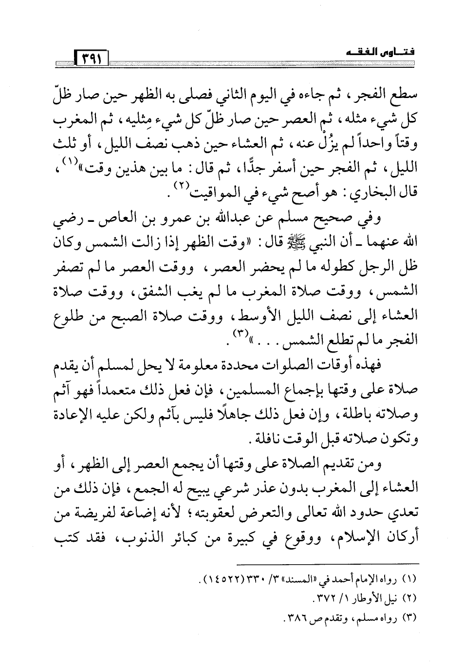 وفي صحيح مسلم عن عبد الله بن عمرو بن العاص -رضي الله عنهما- أن النبي صلي الله عليه وسلم قال: ((وقت الظهر إذا زالت الشمس وكان ظل الرجل كطوله ما لم يحضر العصر، ووقت العصر ما لم تصفر الشمس، ووقت صلاة المغرب ما لم يغب الشفق، ووقت صلاة العشاء إلى نصف الليل الأوسط، ووقت صلاة الصبح من طلوع الفجر ما لم تطلع الشمس....) (3) فهذه أوقات الصلوات محددة معلومة لا يحل لمسلم أن يقدم صلاة على وقتها بإجماع المسلمين، فإن فعل ذلك متعمداً فهو آثم وصلاته باطلة، وإن فعل ذلك جاهلاً فليس بآثم ولكن عليه الإعادة وتكون صلاته قبل الوقت نافلة. ومن تقديم الصلاة على وقتها أن يجمع العصر إلى الظهر، أو العشاء إلى المغرب بدون عذر شرعي يبيح له الجمع، فإن ذلك من تعدي حدود الله تعالى والتعرض لعقوبته؛ لأنه إضاعة لفريضة من أركان الإسلام، ووقوع في كبيرة من كبائر الذنوب، فقد كتب