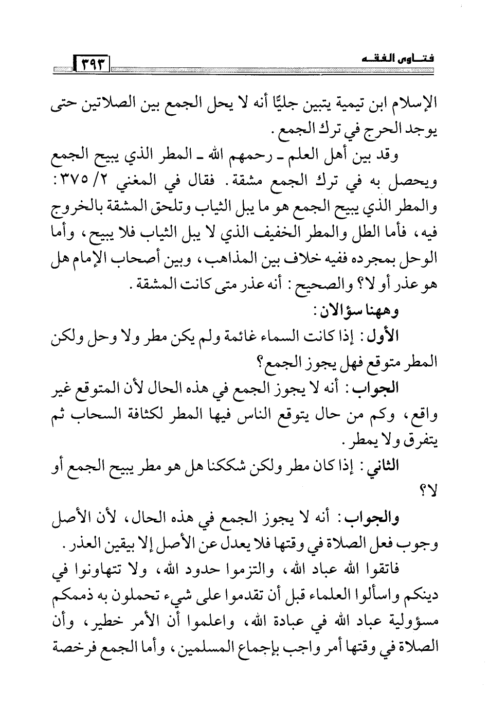 الإسلام ابن تيميه يتبين جلياً أنه لا يحل الجمع بين الصلاتين حتى يوجد الحرج في ترك الجمع.وقد بين أهل العلم - رحمهم الله - المطر الذي يبيح الجمع ويحصل به في ترك الجمع مشقة. فقال في المغني 2/375: والمطر الذي يبيح الجمع هو ما يبل الثياب وتلحق المشقة بالخروج فيه, فأما الطل والمطر الخفيف الذي لا يبل الثياب فلا يبيح, وأما الوحل بمجرده ففيه خلاف بين المذاهب, وبين أصحاب الإمام هل هو عذر أو لا؟ والصحيح: أنه عذر متى كانت المشقة.