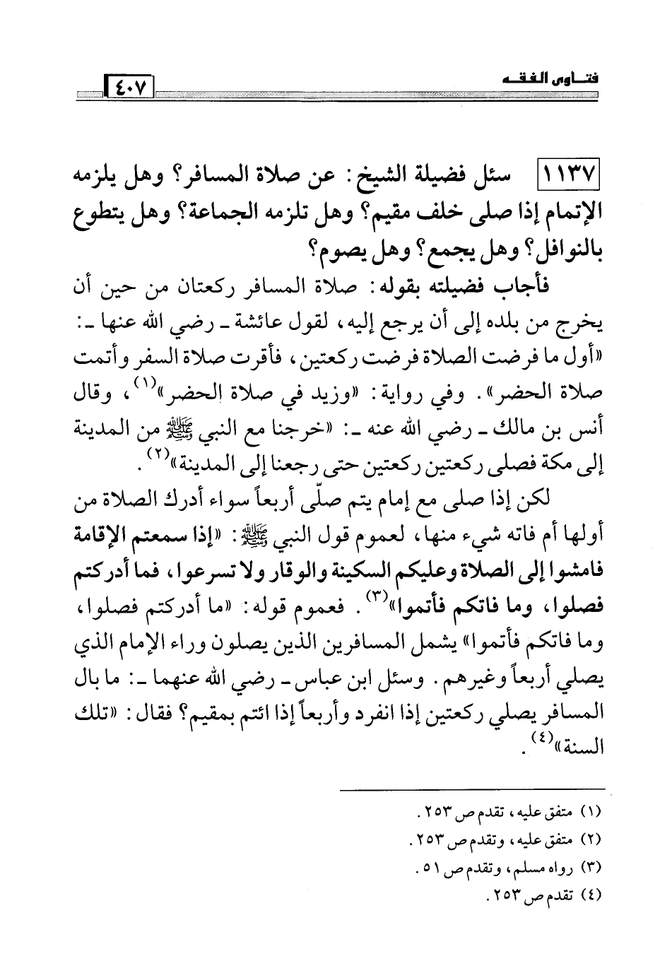 1137 سئل فضيلة الشيخ: عن صلاة المسافر؟ وهل يلزمه الإتمام إذا صلى خلف مقيم؟ وهل تلزمه الجماعة؟ وهل يتطوع بالنوافل؟ وهل يجمع؟ وهل يصوم؟