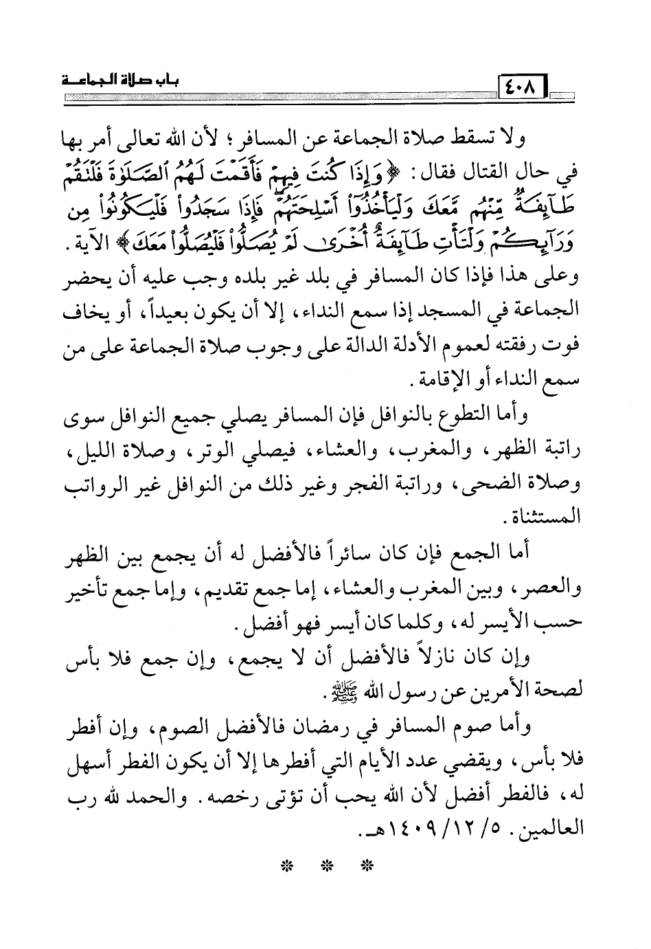 ولا تسقط صلاة الجماعة عن المسافر؛ لأن الله تعالى أمر بها في حال القتال فقال: (وَإِذَا كُنْتَ فِيهِمْ فَأَقَمْتَ لَهُمُ الصَّلاةَ فَلْتَقُمْ طَائِفَةٌ مِنْهُمْ مَعَكَ وَلْيَأْخُذُوا أَسْلِحَتَهُمْ فَإِذَا سَجَدُوا فَلْيَكُونُوا مِنْ وَرَائِكُمْ وَلْتَأْتِ طَائِفَةٌ أُخْرَى لَمْ يُصَلُّوا فَلْيُصَلُّوا مَعَكَ) الآية.
