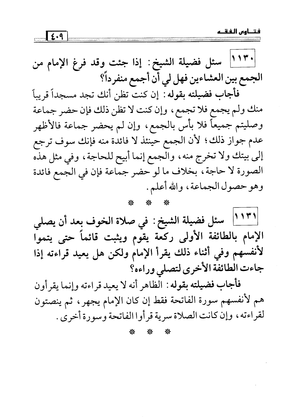 1130 سئل فضيلة الشيخ: إذا جئت وقد فرغ الإمام من الجمع بين العشاءين فهل لي أن أجمع منفرداً؟
