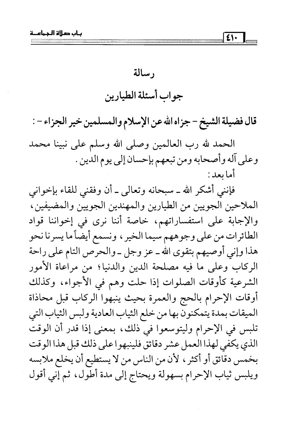 فإنني أشكر الله - سبحانه وتعالى - أن وفقني للقاء بإخواني الملاحين الجويين من الطيارين والمهندسين الجويين والمضيفين, والإجابة على استفساراتهم ,خاصة أننا نرى في إخواننا قواد الطائرات من على وجوههم سيما الخير, ونسمع أيضاً ما يسرنا نحو هم وإني أوصيهم بتقوى الله - عز وجل - والحرص التام على راحة الركاب وعلى ما فيه مصلحة الذين والدنيا؛من مراعاة الأمور الشرعية كأوقات الصلوات إذا حلت وهو في الأجواء, وكذلك أوقات الإحرام بالحج والعمرة بحيث ينبهوا الركاب قبل محاذاة الميقات بمدة يتمكنون بها من خلع الثياب العادية ولبس الثياب التي تلبس في الإحرام وليتوسعوا في ذلك, بمعنى إذا قدر أم الوقت الذي يكفي لهذا العمل عشر دقائق فلينبهوا على ذلك قبل هذا الوقت بخمس الدقائق أو أكثر, لأن من الناس من لا يستطيع أن يخلع ملابسه ويلبس ثياب الإحرام بسهولة ويحتاج إلى مدة أطول, ثم إني أقول