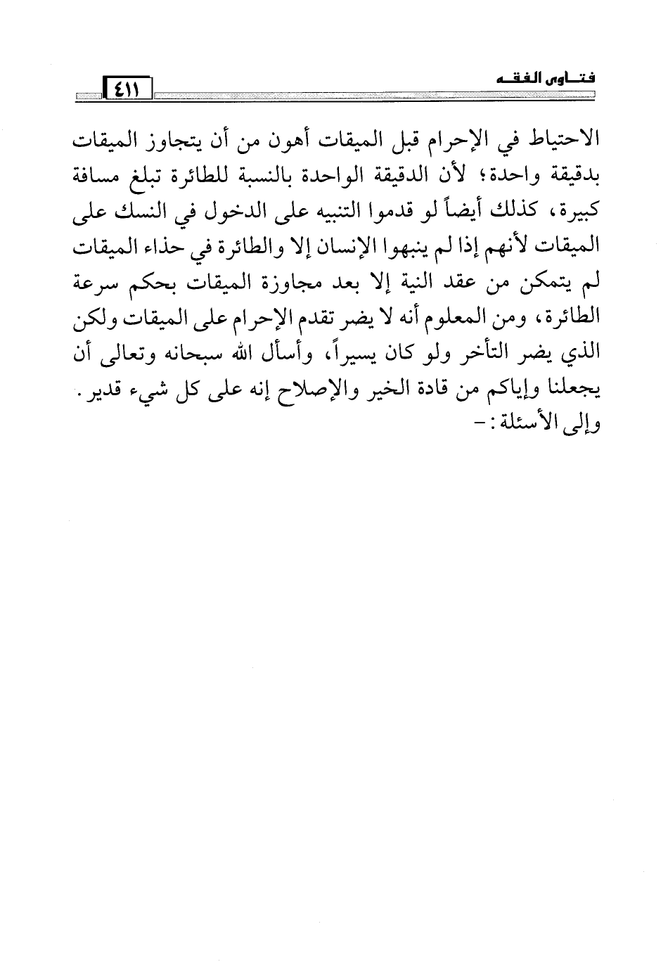 الاحتياط في الإحرام قبل الميقات أهون من أن يتجاوز الميقات بدقيقة واحدة؛ لأن الدقيقة واحدة؛ بالنسبة لطائرة تبلغ مسافة كبيرة, كذلك أيضاً لو قدموا التنبيه على الدخول في النسك على الميقات لأنهم إذا لم ينبهوا الإنسان إلا الطائرة في حذاء الميقات لم يتمكن من عقد النية إلا بعد مجاوز الميقات بحكم سرعة الطائرة, ومن المعلوم أنه لا يضر تقدم الإحرام على الميقات ولكن الذي يضر التأخر ولو كان يسيراً, وأسأل الله سبحانه وتعالى أن يجعلنا وإياكم من قادة الخير والإصلاح إنه على كل شيء قدير.وإلى الأسئلة:-