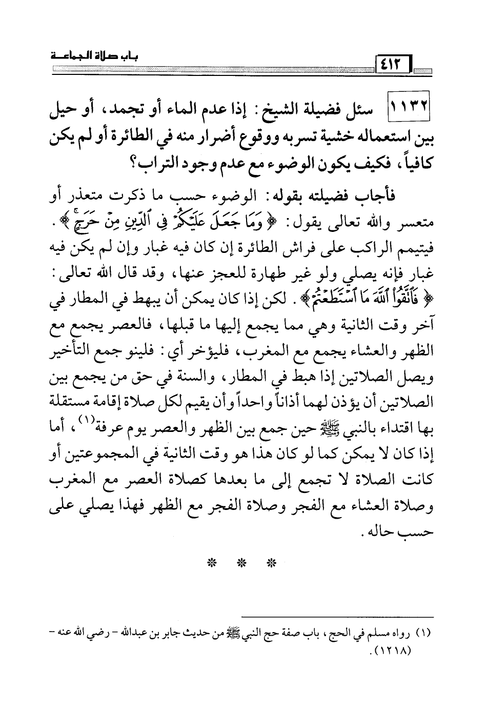 فأجاب فضيلته بقوله: الوضوء حسب ما ذكرت متعذر أو متعسر والله تعالى يقول: (وَمَا جَعَلَ عَلَيْكُمْ فِي الدِّينِ مِنْ حَرَجٍ) . فتيمم الراكب على فراش إن كان فيه غبار وإن لم يكن فيه غبار فإنه يصلي ولو غير طهارة للعجز عنها, وقدر الله تعالى: (فَاتَّقُوا اللَّهَ مَا اسْتَطَعْتُمْ) . لكن إذا كان يمكن أن يهبط في المطار في آخر الوقت الثانية وهي مما يجمع إليها ما قبلها, فالعصر يجمع مع الظهر والعشاء يجمع مع المغرب, فليؤخر أي: فلينو جمع التأخير ويصل صلاتين إذا هبط في المطار, والسنة في حق من يجمع بين الصلاتين أن يؤذن لهما أذاناً واحداً وأن يقيم لكل لصلاة إقامة مستقلة بها إقتداء بالنبي صلى الله وسلم حين جمع بين الظهر والعصر يوم عرفة (1) ,أما إذا كان لا يمكن كما لو كان هذا هو وقت الثانية في المجموعتين أو كانت الصلاة لا تجمع إلى ما بعدها كصلاة العصر مع المغرب وصلاة العشاء مع الفجر مع الظهر فهذا يصلي على حسب حاله.