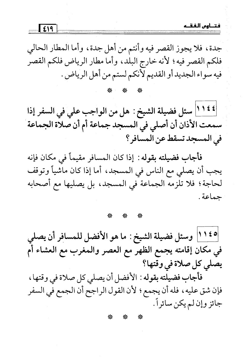 1144 سئل فضيلة الشيخ: هل من الواجب على في السفر إذا سمعت الأذان أن أصلي في المسجد جماعة أم أن صلاة الجماعة في المسجد تسقط عن المسافر؟