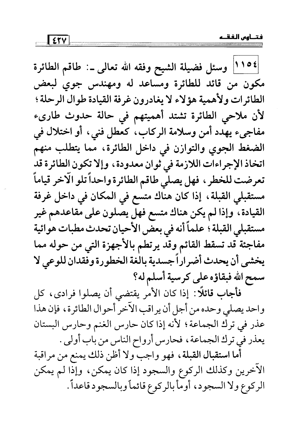 1154 وسئل فضيلة الشيخ وفقه الله تعالى -:طاقم الطائرة مكون من قائد للطائرة ومساعد له ومهندس جوي لبعض الطائرات ولأهمية هؤلاء لا يغادرون غرفة القيادة طوال الرحلة؛ لأن ملاحي الطائرة تشتد أهميتهم في حالة حدوث الطارئ مفاجئ يهدد أمن وسلامة الركاب, كعطل فني, أو اختلال في الضغط الجوي والتوازن في داخل الطائرة, مما يتطلب منهم اتخاذ الإجراءات اللازمة في ثوان معدودة, وإلا تكون الطائرة قد تعرضت للخطر, فهل يصلي طاقم الطائرة واحداً تلو الآخر قياماً مستقبلي القبلة, وإذا كان هناك متسع في المكان في داخل غرفة القيادة, وإذا لم يكن هناك متسع فهل يصلون على مقاعدهم غير مستقبلي القبلة؛ علماً أنه بعض الأحيان تحدث مطبات هوائية مفاجئة قد تسقط القائم وقد يرتطم بالأجهزة التي من حوله مما يخشى أن يحدث أضراراً جسدية بالغة الخطورة وفقدان للوعي لا سمح الله فبقاؤه على كرسيه أسلم له؟