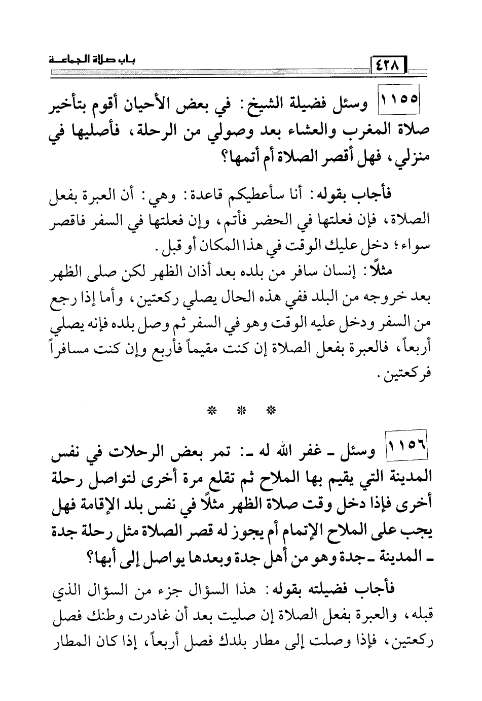 فأجاب قائلاً: أنا سأعطيكم قاعدة: وهي: أن العبرة بفعل الصلاة, فإن فعلتها في الحضر فأتم, وإن فعلتها في السفر فاقصر سواء؛ دخل عليك الوقت في هذا المكان أو قبل. مثلاً: إنسان سافر من بلده بعد أذان الظهر لكن صلى الظهر بعد خروجه من البلد ففي هذه الحال يصلي ركعتين, وأما إذا رجع من السفر ودخل عليه الوقت وهو في السفر ثم وصل بلده فإنه يصلي أربعاً, فالعبرة بفعل الصلاة إن كنت مقيماً فأربع وإن كنت مسافراً فركعتين.