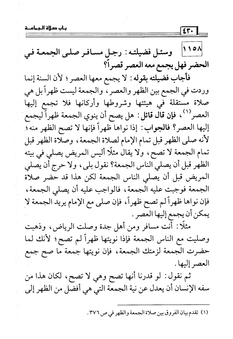 1158 وسئل فضيلته: رجل مسافر صلى الجمعة في الحضر فهل يجمع معه العصر قصراً؟