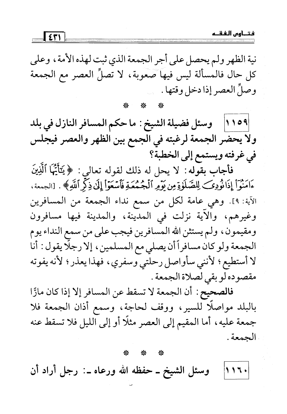 1159 وسئل فضيلة الشيخ: ما حكم المسافر النازل في بلد ولا يحضر الجمعة لرغبته في الجمع بين الظهر والعصر فيجلس في غرفته ويستمع إلى الخطبة؟