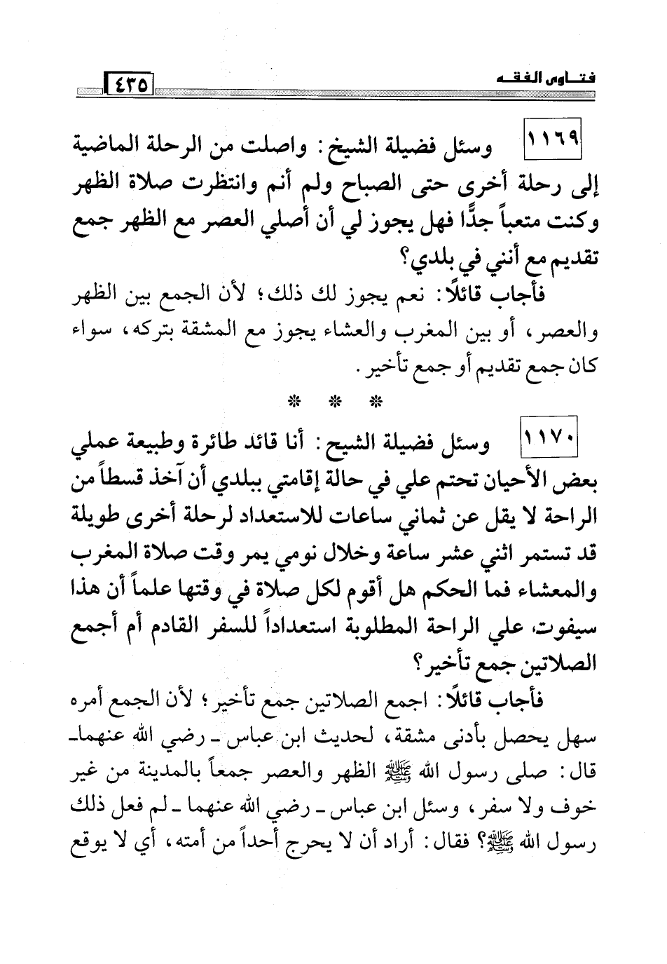1169 وسئل فضيلة الشيخ: وصلت من الرحلة الماضية إلى رحلة أخرى حتى الصباح ولم أنم وانتظرت صلاة الظهر وكنت متعباً جداً فهل يجوز لي أن أصلي العصر مع الظهر جمع تقديم مع أنني في بلدي؟