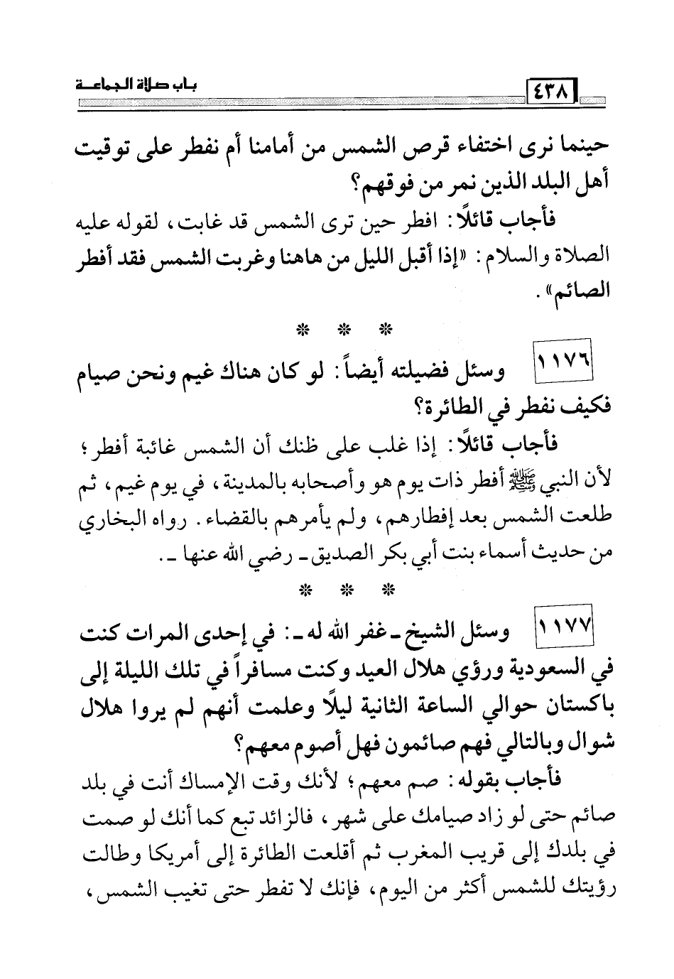 1177 وسئل الشيخ – غفر الله له -:في إحدى المرات كنت في السعودية ورؤى هلال العيد وكنت مسافراً في تلك الليلة إلى باكستان حوالي الساعة الثانية ليلاً وعلمت أنهم لم يروا هلال شوال وبالتالي فهم صائمون فهل أصوم معهم؟ فأجاب بقوله: صم معهم؛ لأنك وقت الإمساك أنت في بلد صائم حتى لو زاد صيامك على شهر, فالزائد تبع كما أنك لو صمت في بلدك إلى قريب المغرب ثم أقلعت الطائرة إلى أمريكا وطالت رؤيتك للشمس أكثر من اليوم؛ فإنك لا تفطر حتى تغيب الشمس ,