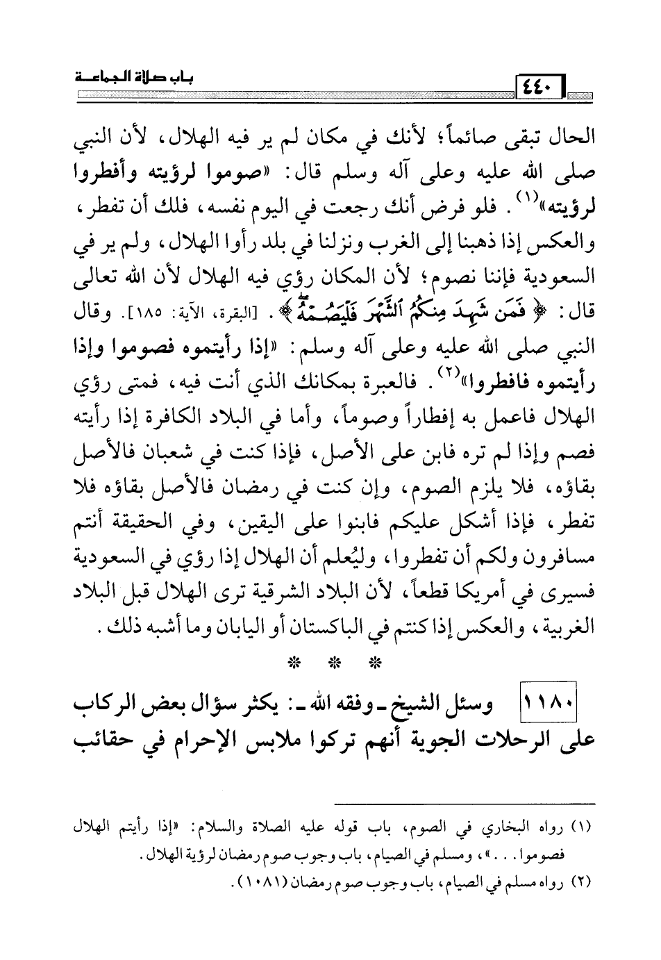 الحال تبقى صائماً؛ لأنك في مكان لم ير فيه الهلال, لأن النبي صلي الله عليه وسلم قال (صوموا لرؤيته وأفطروا لرؤيته) (1) . فلو فرض أنك رجعت في اليوم نفسه, فلك أن تفطر, والعكس إذا ذهبنا إلى الغرب ونزلنا في بلد رأوا الهلال, ولم يرى في السعودية فإننا نصوم؛ لأن المكان رؤيا فيه الهلال لأن الله تعالى قال: (فَمَنْ شَهِدَ مِنْكُمُ الشَّهْرَ فَلْيَصُمْهُ) (البقرة: من الآية185) .وقال النبي صلي الله عليه وسلم (إذا رأيتموه فصوموا وإذا رأيتموه فافطروا) (2) .فالعبرة بمكانك الذي أنت فيه, فمتى رؤى الهلال فاعمل به إفطاراً وصوماً, وأما في البلاد الكافرة إذا رأيته فصم وإذا لم تره فابن على الأصل, فإذا كنت في شعبان فالأصل بقاؤه, فلا يلزم الصوم, وإن كنت في رمضان فالأصل بقاؤه فلا تفطر, فإذا أشكل عليكم فابنوا على اليقين, وفي الحقيقة أنتم مسافرون ولكم أن تفطروا, وليعلم أن الهلال إذا رؤى في السعودية فسيري في أمريكا قطعاً, لأن البلاد الشرقية ترى الهلال قبل البلاد الغريبة, والعكس إذا كنتم في الباكستان أو اليابان وما أشبه ذلك.