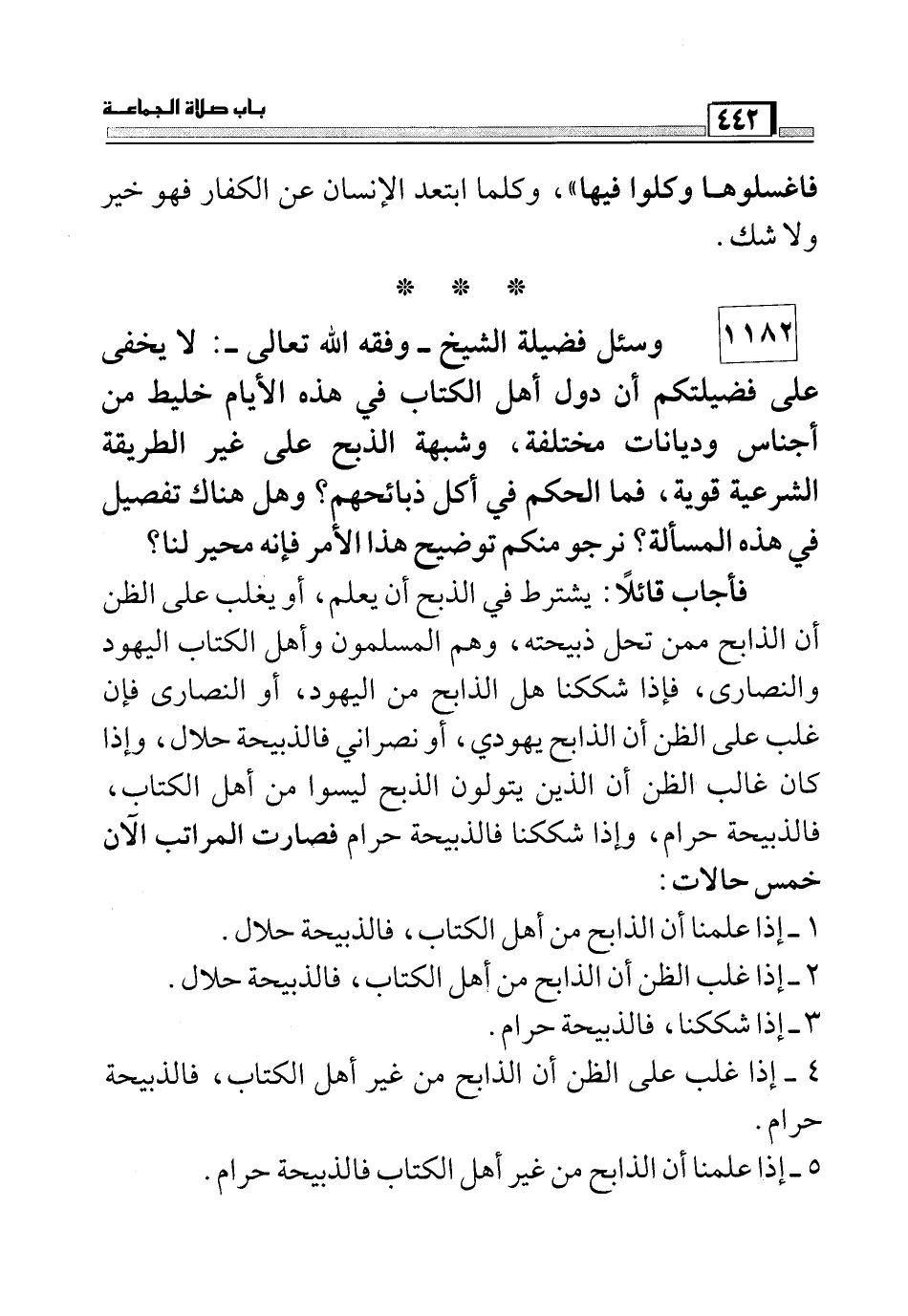فأجاب قائلاً: يشترط في الذبح أن يعلم, أو يغلب على الظن أن الذابح ممن تحل ذبيحته, وهم المسلمون وأهل الكتاب اليهود والنصارى, فإذا شككنا هل الذابح من اليهود, أو النصارى فإن غلب على الظن أن الذابح يهودي, أو نصراني فالذبيحة حلال, وإذا أن غالب الظن أن الذين يتولون الذبح ليسوا من أهل الكتاب, فالذبيحة حرام, وإذا شككنا فالذبيحة حرام فصارت المراتب الآن خمس حالات: