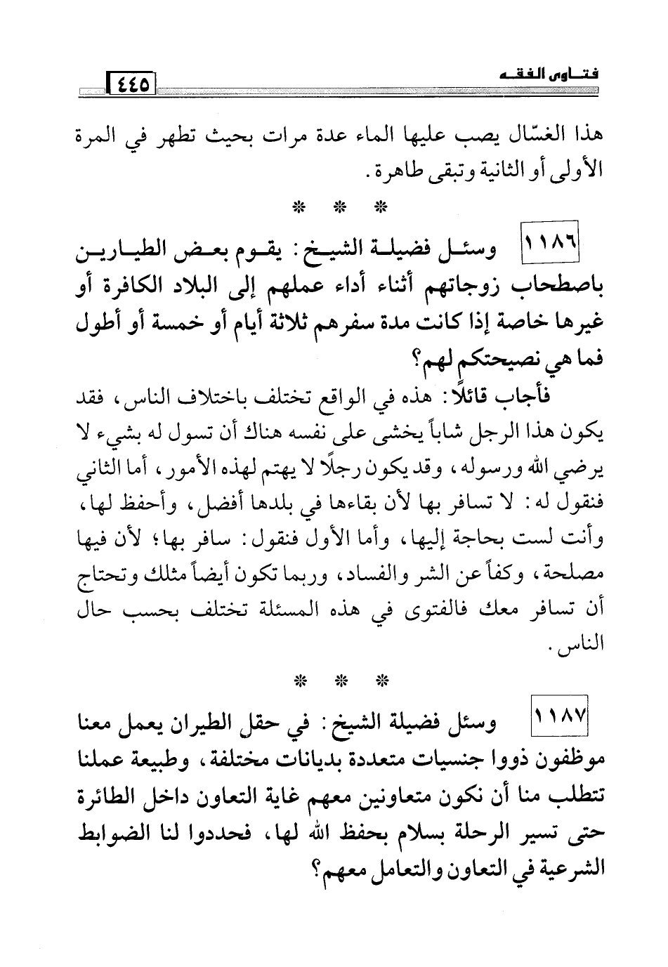 1186 وسئل فضيلة الشيخ: يقوم بعض الطيارين باصطحاب زوجاتهم أثناء أداء عملهم إلى البلاد الكافرة أو غيرها خاصة إذا كانت مدة سفرهم ثلاثة أيام أو خمسة أو أطول فما نصيحتكم لهم؟