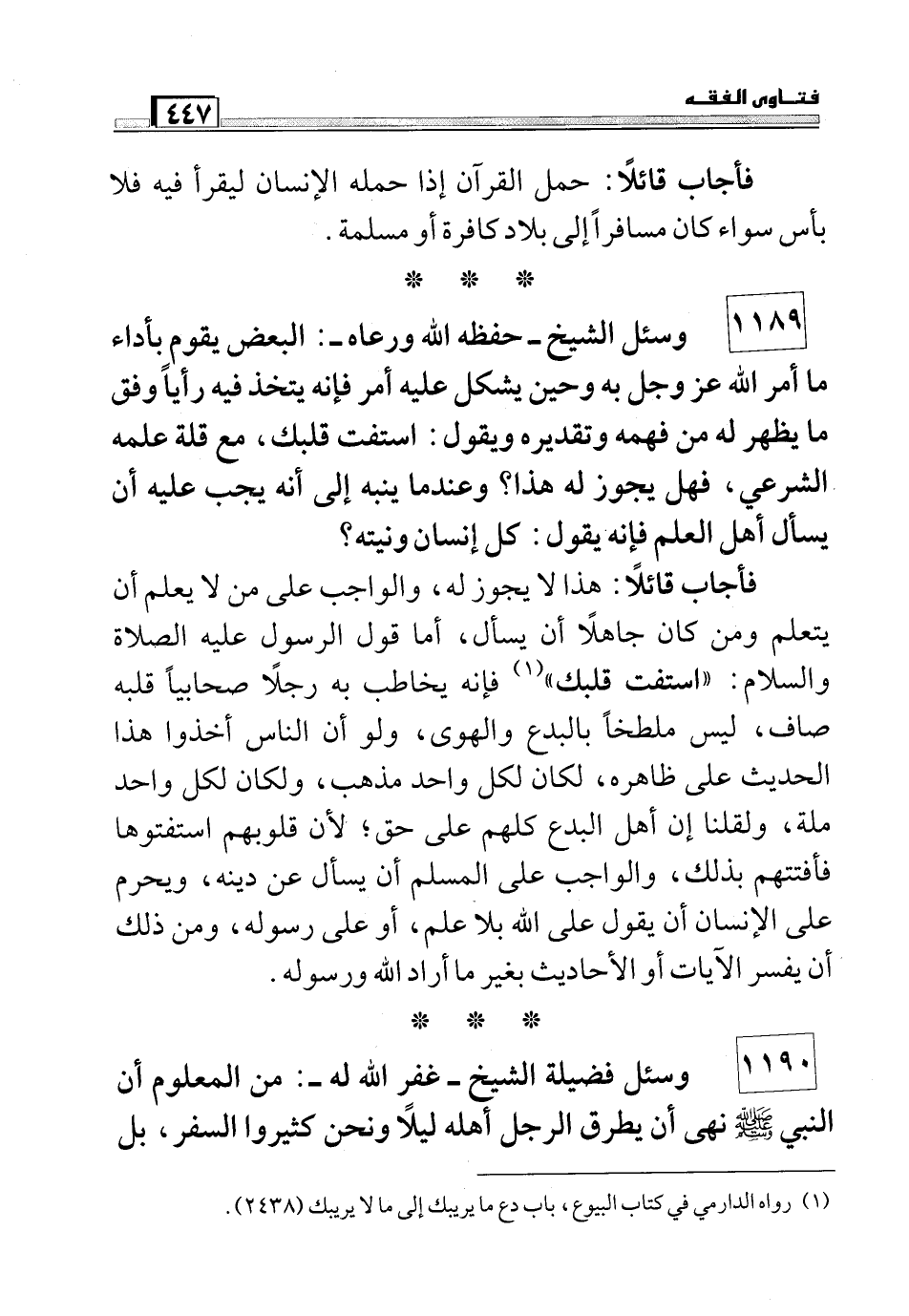 1189 وسئل الشيخ – حفظه الله ورعاه -:البعض يقوم بأداء ما أمر الله عز وجل وحين يشكل عليه أمر فإنه يتخذ فيه رأياً وفق ما يظهر له من فهمه وتقديره ويقول: استفت قلبك, مع قلة علمه الشرعي, فهل يجوز له هذا؟ وعندما ينبه إلى أنه يجب عليه أن يسأل أهل العلم فإنه يقول: كل إنسان ونيته؟