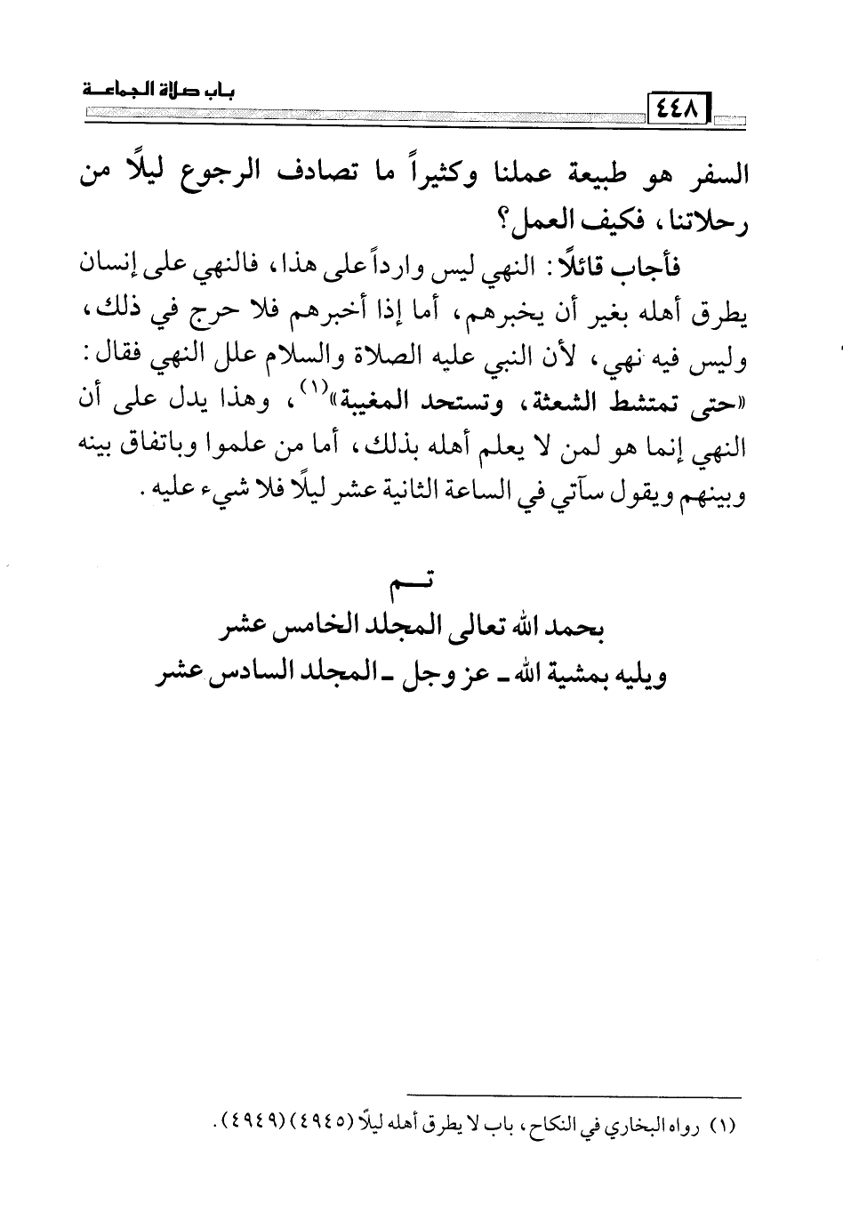 فأجاب قائلاً: النهي ليس وارداً على هذا, فالنهي على إنسان يطرق أهله بغير أن يخبرهم, أما إذا أخبرهم فلا حرج في ذلك, وليس فيه نهي, لأن النبي عليه الصلاة والسلام علل النهي فقال صلي الله عليه وسلم (حتى تمشط الشعثة, وتستحد المغيبة) (1) ,وهذا يدل على أن النهي إنما هو لمن لا يعلم أهله بذلك, أما من علموا وباتفاق بينه وبينهم ويقول سآتي في الساعة الثانية عشر ليلاً فلا شيء عليه.