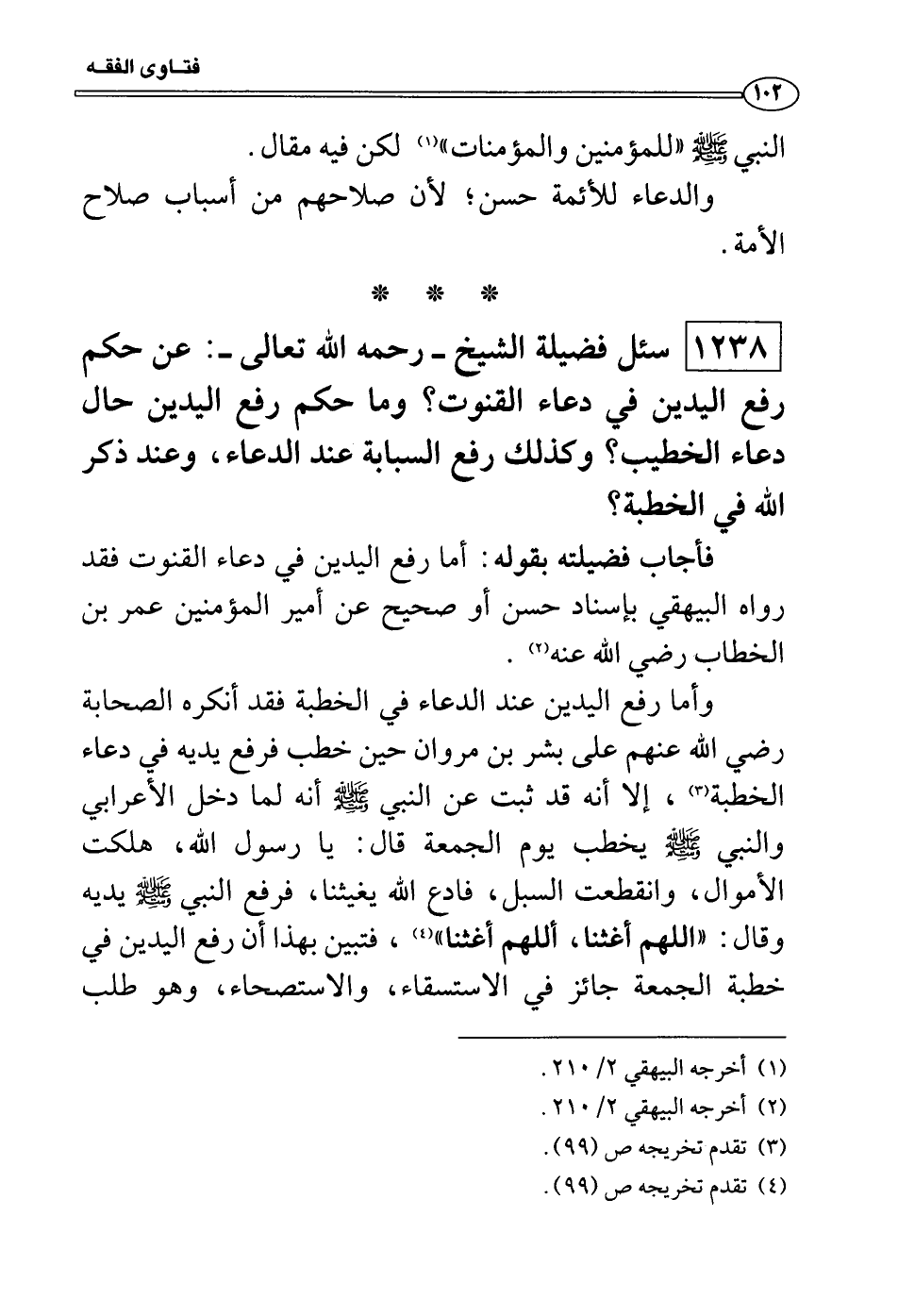 فأجاب فضيلته بقوله: أما رفع اليدين في دعاء القنوت فقد رواه البيهقي بإسناد حسن أو صحيح عن أمير المؤمنين عمر بن الخطاب رضي الله عنه.
