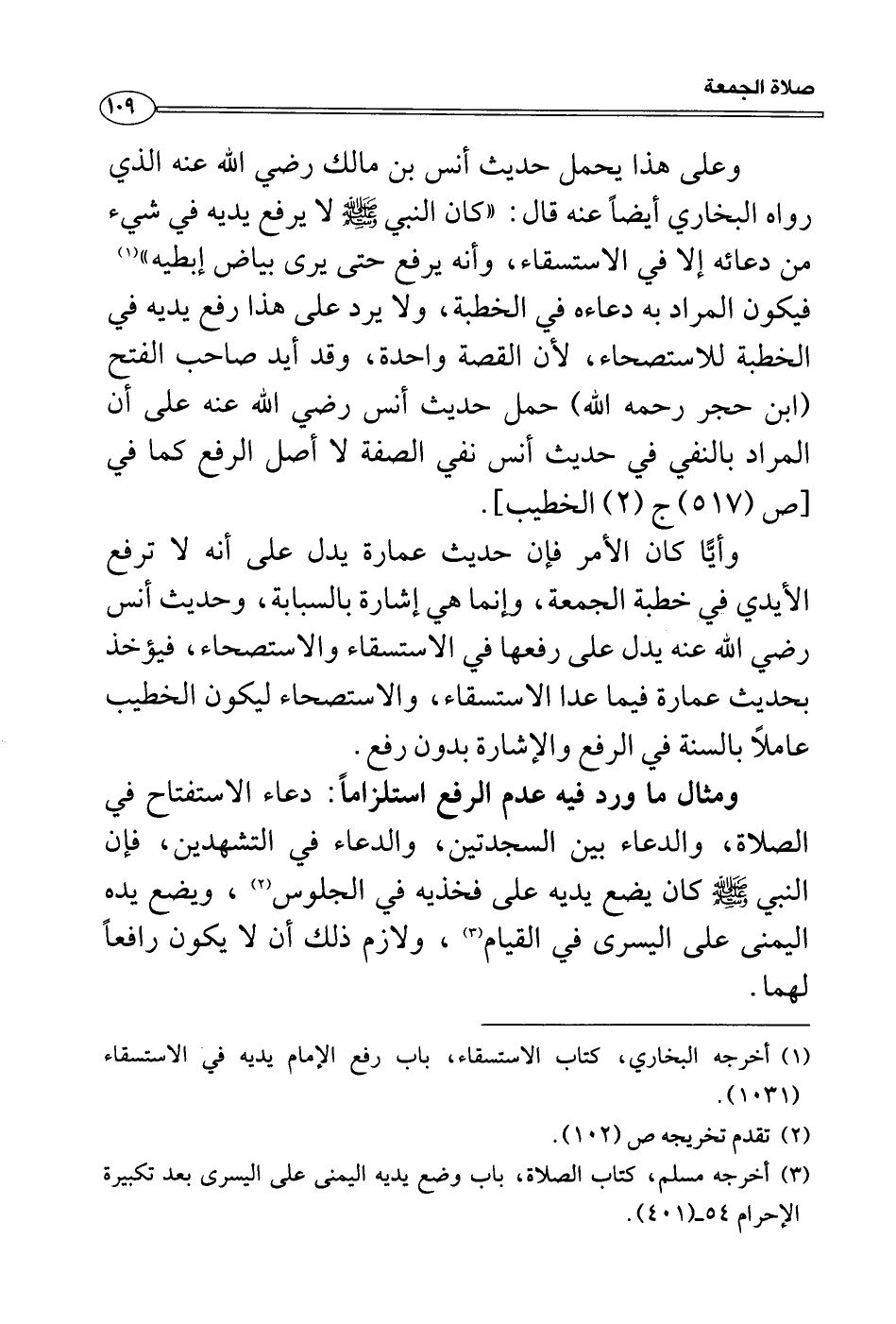 وعلى هذا يحمل حديث أنس بن مالك رضي الله عنه الذي رواه البخاري أيضاً عنه قال: «كان النبي صَلَّى اللَّهُ عَلَيْهِ وَسَلَّمَ لا يرفع يديه في شيء من دعائه إلا في الاستسقاء، وأنه يرفع حتى يرى بياض إبطيه» فيكون المراد به دعاءه في الخطبة، ولا يرد على هذا رفع يديه في الخطبة للاستصحاء، لأن القصة واحدة، وقد أيد صاحب الفتح (ابن حجر رحمه الله) حمل حديث أنس رضي الله عنه على أن المراد بالنفي في حديث أنس نفي الصفة لا أصل الرفع كما في [ص (715) ج (2) الخطيب] .