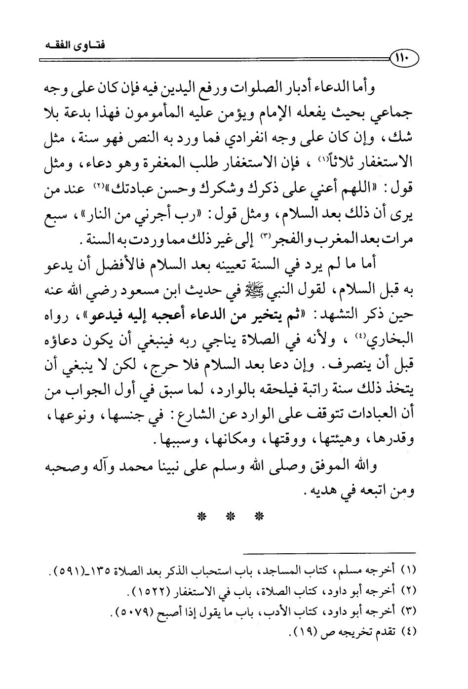 وأما الدعاء أدبار الصلوات ورفع اليدين فيه فإن كان على وجه جماعي بحيث يفعله الإمام ويؤمن عليه المأمومون فهذا بدعة بلا شك، وإن كان على وجه انفرادي فما ورد به النص فهو سنة، مثل الاستغفار ثلاثاً، فإن الاستغفار طلب المغفرة وهو دعاء، ومثل قول: «اللهم أعني على ذكرك وشكرك وحسن عبادتك» عند من يرى أن ذلك بعد السلام، ومثل قول: «رب أجرني من النار» ، سبع مرات بعد المغرب والفجر إلى غير ذلك مما وردت به السنة.