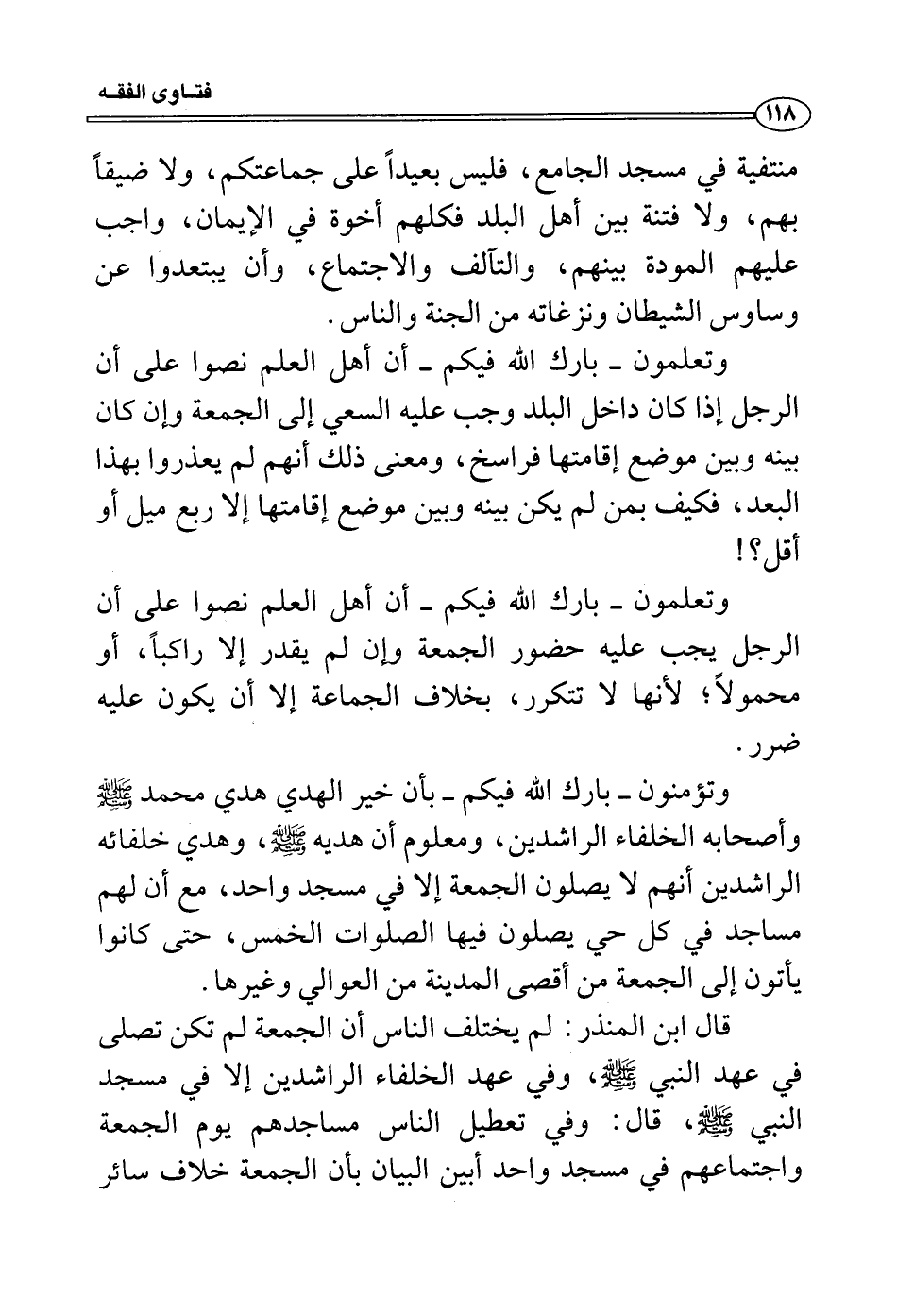وتعلمون بارك الله فيكم أن أهل العلم نصوا على أن الرجل إذا كان داخل البلد وجب عليه السعي إلى الجمعة وإن كان بينه وبين موضع إقامتها فراسخ، ومعنى ذلك أنهم لم يعذروا بهذا البعد، فكيف بمن لم يكن بينه وبين موضع إقامتها إلا ربع ميل أو أقل؟!