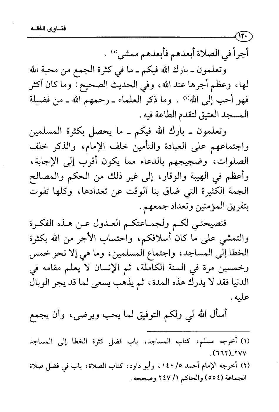 فنصيحتي لكم ولجماعتكم العدول عن هذه الفكرة والتمشي على ما كان أسلافكم، واحتساب الأجر من الله بكثرة الخطا إلى المساجد، واجتماع المسلمين، وما هي إلا نحو خمس وخمسين مرة في السنة الكاملة، ثم الإنسان لا يعلم مقامه في الدنيا فقد لا يدرك هذه المدة، ثم يذهب يسعى لما قد يجر الوبال عليه.