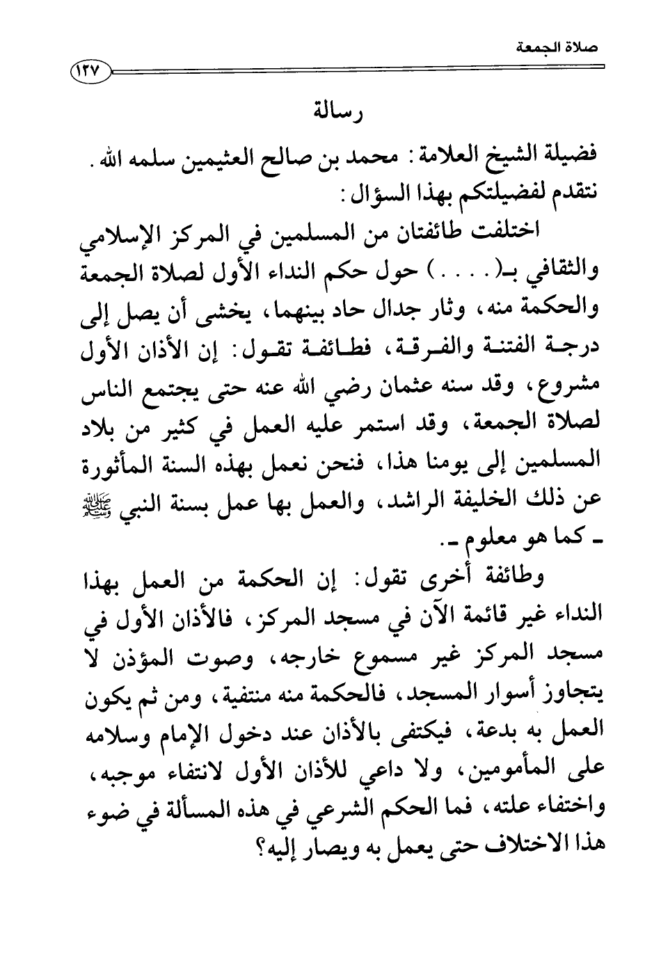 اختلفت طائفتان من المسلمين في المركز الإسلامي والثقافي ب (....) حول حكم النداء الأول لصلاة الجمعة والحكمة منه، وثار جدال حاد بينهما، يخشى أن يصل إلى درجة الفتنة والفرقة، فطائفة تقول: إن الأذان الأول مشروع، وقد سنه عثمان رضي الله عنه حتى يجتمع الناس لصلاة الجمعة، وقد استمر عليه العمل في كثير من بلاد المسلمين إلى يومنا هذا، فنحن نعمل بهذه السنة المأثورة عن ذلك الخليفة الراشد، والعمل بها عمل بسنة النبي صَلَّى اللَّهُ عَلَيْهِ وَسَلَّمَ كما هو معلوم.