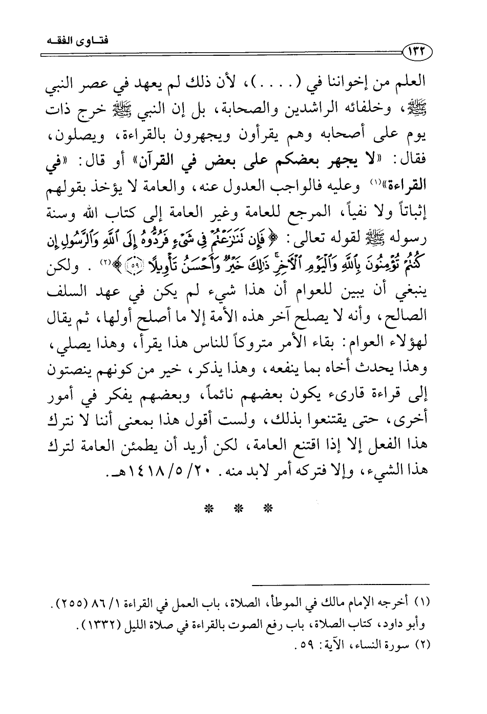 العلم من إخواننا في (....) ، لأن ذلك لم يعهد في عصر النبي صَلَّى اللَّهُ عَلَيْهِ وَسَلَّمَ، وخلفائه الراشدين والصحابة، بل إن النبي صَلَّى اللَّهُ عَلَيْهِ وَسَلَّمَ خرج ذات يوم على أصحابه وهم يقرأون ويجهرون بالقراءة، ويصلون، فقال: «لا يجهر بعضكم على بعض في القرآن» أو قال: «في القراءة» وعليه فالواجب العدول عنه، والعامة لا يؤخذ بقولهم إثباتاً ولا نفياً، المرجع للعامة وغير العامة إلى كتاب الله وسنة رسوله صَلَّى اللَّهُ عَلَيْهِ وَسَلَّمَ لقوله تعالى: {فَإِن تَنَازَعْتُمْ فِى شَىْءٍ فَرُدُّوهُ إِلَى اللهِ وَالرَّسُولِ إِن كُنتُمْ تُؤْمِنُونَ بِاللهِ وَالْيَوْمِ الأَْخِرِ ذالِكَ خَيْرٌ وَأَحْسَنُ تَأْوِيلاً} . ولكن ينبغي أن يبين للعوام أن هذا شيء لم يكن في عهد السلف الصالح، وأنه لا يصلح آخر هذه الأمة إلا ما أصلح أولها، ثم يقال لهؤلاء العوام: بقاء الأمر متروكاً للناس هذا يقرأ، وهذا يصلي، وهذا يحدث أخاه بما ينفعه، وهذا يذكر، خير من كونهم ينصتون إلى قراءة قارىء يكون بعضهم نائماً، وبعضهم يفكر في أمور أخرى، حتى يقتنعوا بذلك، ولست أقول هذا بمعنى أننا لا نترك هذا الفعل إلا إذا اقتنع العامة، لكن أريد أن يطمئن العامة لترك هذا الشيء، وإلا فتركه أمر لابد منه. 20 /5/1418هـ.
