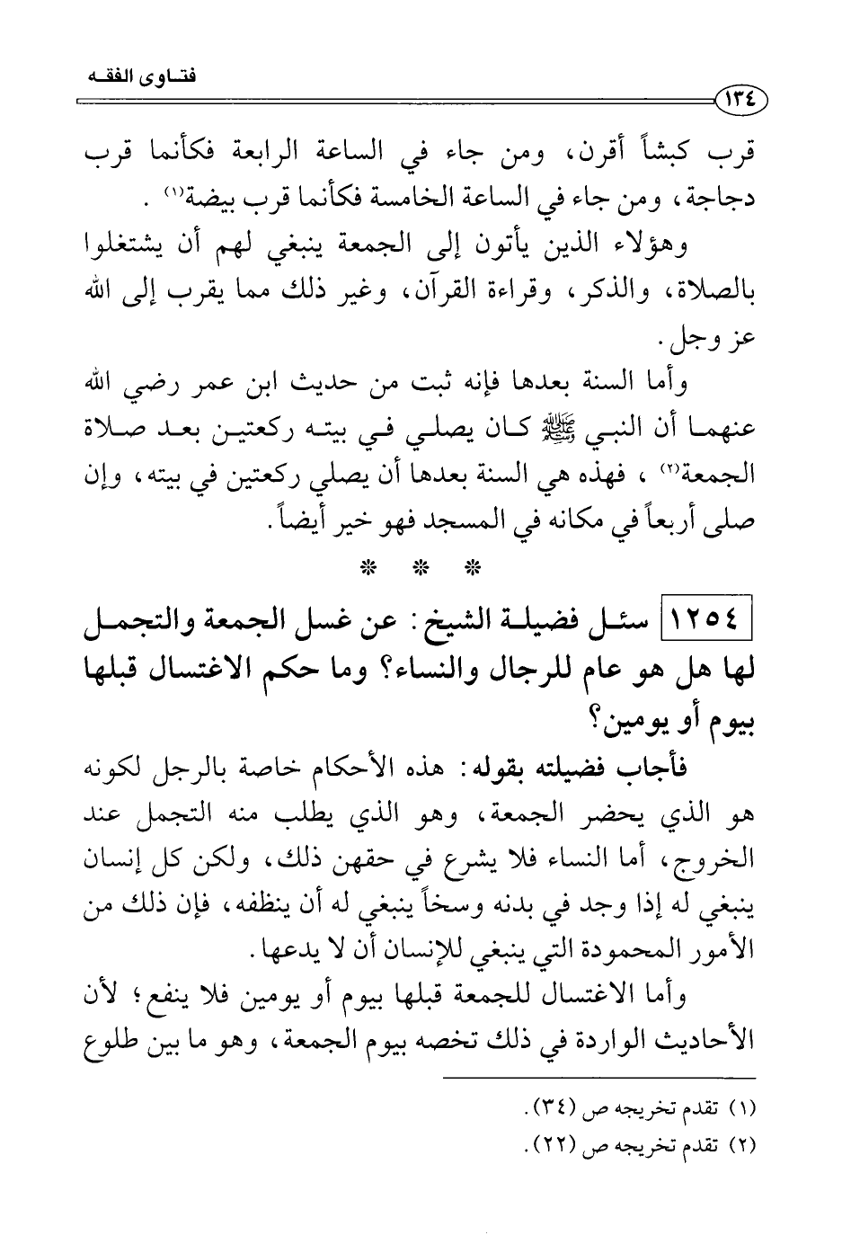 سئل فضيلة الشيخ: عن غسل الجمعة والتجمل لها هل هو عام للرجال والنساء؟ وما حكم الاغتسال قبلها بيوم أو يومين؟