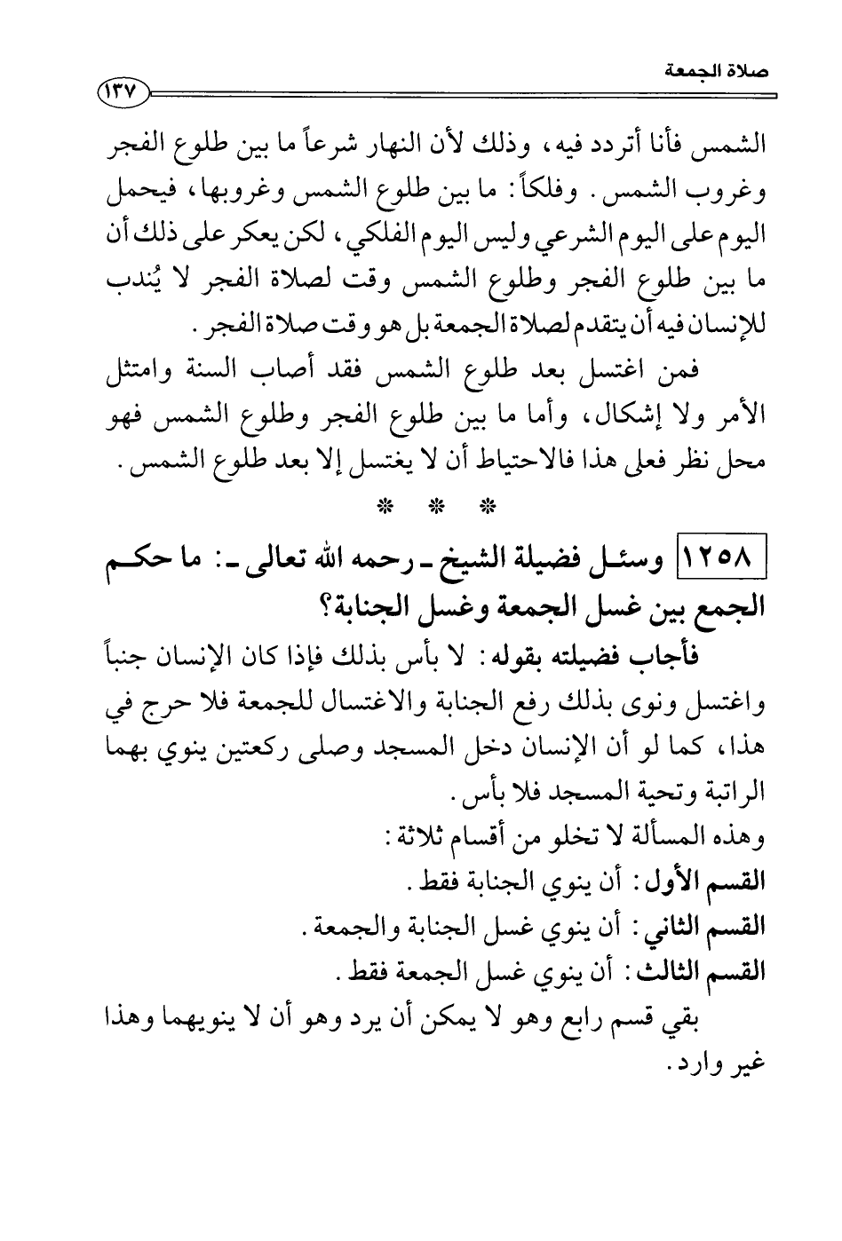 وسئل فضيلة الشيخ - رحمه الله تعالى -: ما حكم الجمع بين غسل الجمعة وغسل الجنابة؟