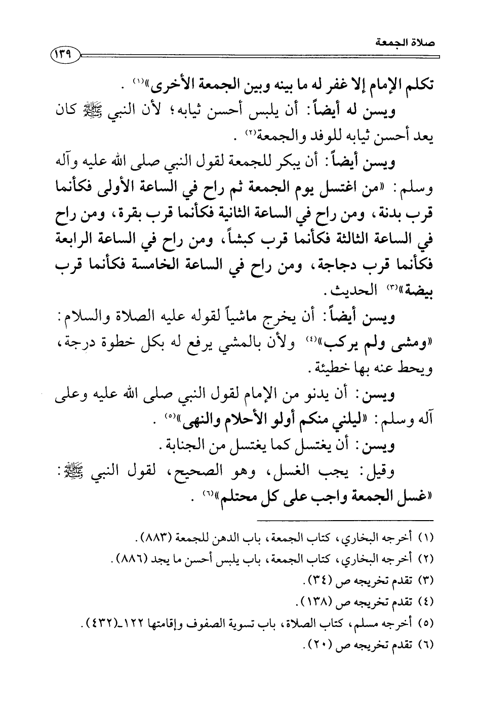 ويسن أيضاً: أن يبكر للجمعة لقول النبي صلى الله عليه وآله وسلم: «من اغتسل يوم الجمعة ثم راح في الساعة الأولى فكأنما قرب بدنة، ومن راح في الساعة الثانية فكأنما قرب بقرة، ومن راح في الساعة الثالثة فكأنما قرب كبشاً، ومن راح في الساعة الرابعة فكأنما قرب دجاجة، ومن راح في الساعة الخامسة فكأنما قرب بيضة» الحديث.