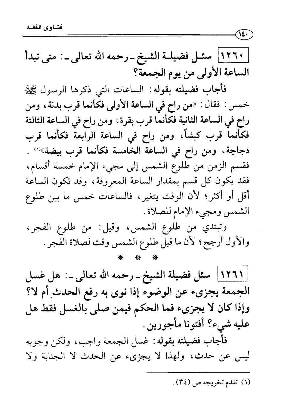 فأجاب فضيلته بقوله: الساعات التي ذكرها الرسول صَلَّى اللَّهُ عَلَيْهِ وَسَلَّمَ خمس: فقال: «من راح في الساعة الأولى فكأنما قرب بدنة، ومن راح في الساعة الثانية فكأنما قرب بقرة، ومن راح في الساعة الثالثة فكأنما قرب كبشاً، ومن راح في الساعة الرابعة فكأنما قرب دجاجة، ومن راح في الساعة الخامسة فكأنما قرب بيضة» . فقسم الزمن من طلوع الشمس إلى مجيء الإمام خمسة أقسام، فقد يكون كل قسم بمقدار الساعة المعروفة، وقد تكون الساعة أقل أو أكثر؛ لأن الوقت يتغير، فالساعات خمس ما بين طلوع الشمس ومجيء الإمام للصلاة.