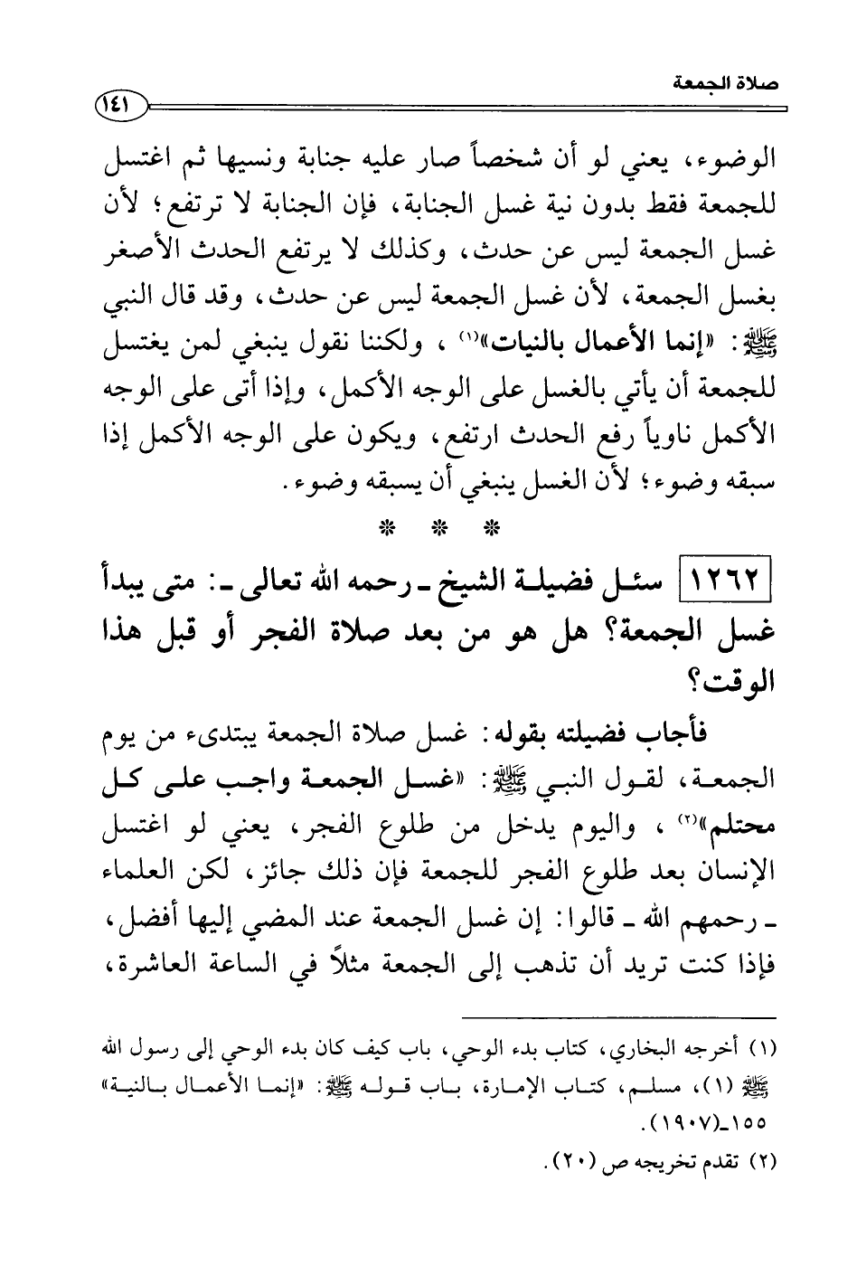 فأجاب فضيلته بقوله: غسل صلاة الجمعة يبتدىء من يوم الجمعة، لقول النبي صَلَّى اللَّهُ عَلَيْهِ وَسَلَّمَ: «غسل الجمعة واجب على كل محتلم» ، واليوم يدخل من طلوع الفجر، يعني لو اغتسل الإنسان بعد طلوع الفجر للجمعة فإن ذلك جائز، لكن العلماء رحمهم الله قالوا: إن غسل الجمعة عند المضي إليها أفضل، فإذا كنت تريد أن تذهب إلى الجمعة مثلاً في الساعة العاشرة،