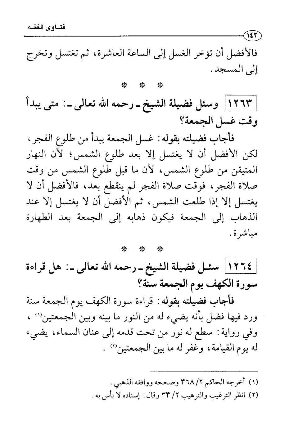 فأجاب فضيلته بقوله: غسل الجمعة يبدأ من طلوع الفجر، لكن الأفضل أن لا يغتسل إلا بعد طلوع الشمس؛ لأن النهار المتيقن من طلوع الشمس، لأن ما قبل طلوع الشمس من وقت صلاة الفجر، فوقت صلاة الفجر لم ينقطع بعد، فالأفضل أن لا يغتسل إلا إذا طلعت الشمس، ثم الأفضل أن لا يغتسل إلا عند الذهاب إلى الجمعة فيكون ذهابه إلى الجمعة بعد الطهارة مباشرة.