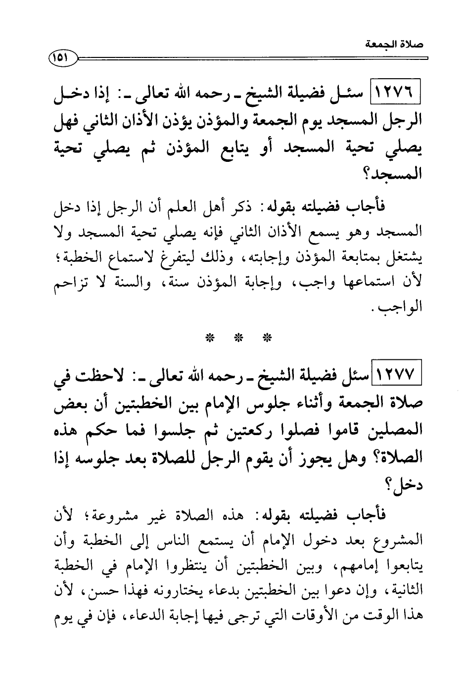 سئل فضيلة الشيخ - رحمه الله تعالى -: لاحظت في صلاة الجمعة وأثناء جلوس الإمام بين الخطبتين أن بعض المصلين قاموا فصلوا ركعتين ثم جلسوا فما حكم هذه الصلاة؟ وهل يجوز أن يقوم الرجل للصلاة بعد جلوسه إذا دخل؟