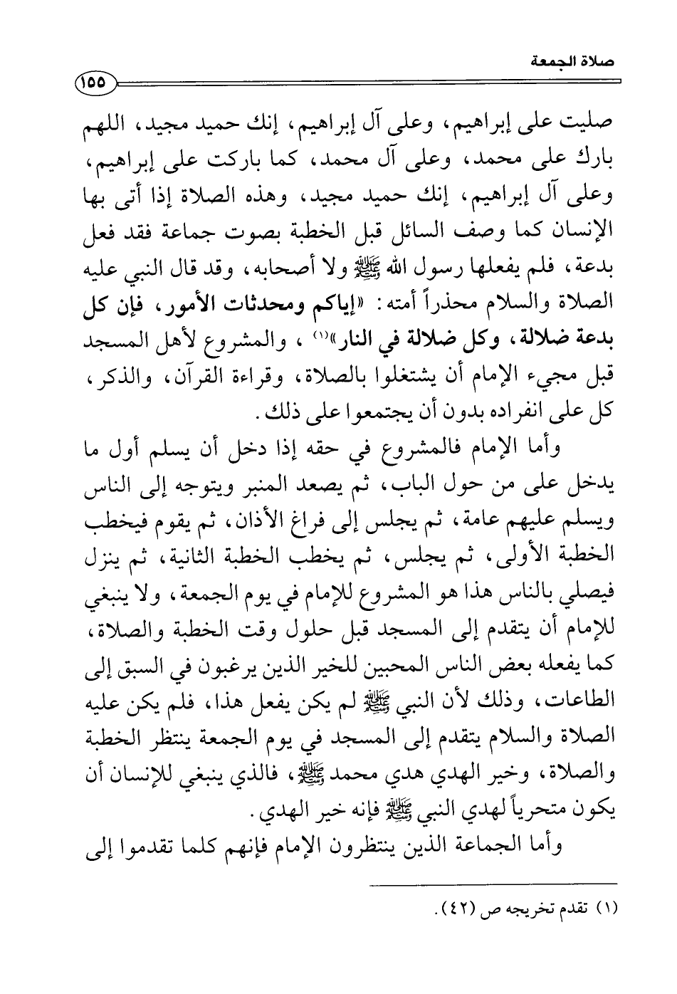 صليت على إبراهيم، وعلى آل إبراهيم، إنك حميد مجيد، اللهم بارك على محمد، وعلى آل محمد، كما باركت على إبراهيم، وعلى آل إبراهيم، إنك حميد مجيد، وهذه الصلاة إذا أتى بها الإنسان كما وصف السائل قبل الخطبة بصوت جماعة فقد فعل بدعة، فلم يفعلها رسول الله صَلَّى اللَّهُ عَلَيْهِ وَسَلَّمَ ولا أصحابه، وقد قال النبي عليه الصلاة والسلام محذراً أمته: «إياكم ومحدثات الأمور، فإن كل بدعة ضلالة، وكل ضلالة في النار» ، والمشروع لأهل المسجد قبل مجيء الإمام أن يشتغلوا بالصلاة، وقراءة القرآن، والذكر، كل على انفراده بدون أن يجتمعوا على ذلك.