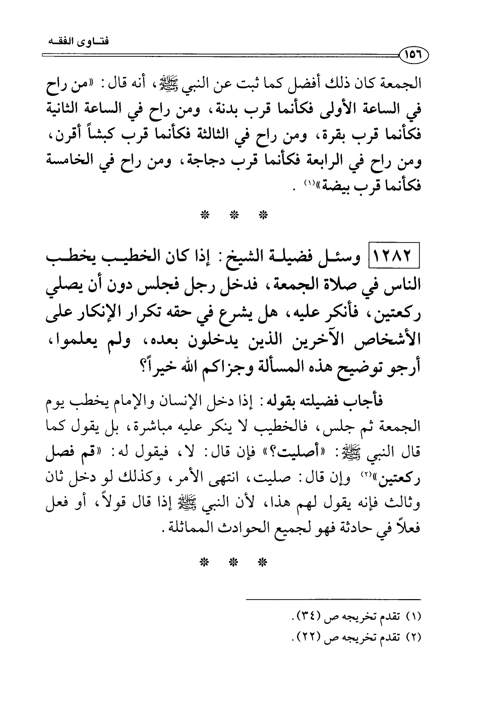 فأجاب فضيلته بقوله: إذا دخل الإنسان والإمام يخطب يوم الجمعة ثم جلس، فالخطيب لا ينكر عليه مباشرة، بل يقول كما قال النبي صَلَّى اللَّهُ عَلَيْهِ وَسَلَّمَ: «أصليت؟» فإن قال: لا، فيقول له: «قم فصل ركعتين» وإن قال: صليت، انتهى الأمر، وكذلك لو دخل ثان وثالث فإنه يقول لهم هذا، لأن النبي صَلَّى اللَّهُ عَلَيْهِ وَسَلَّمَ إذا قال قولاً، أو فعل فعلاً في حادثة فهو لجميع الحوادث المماثلة.
