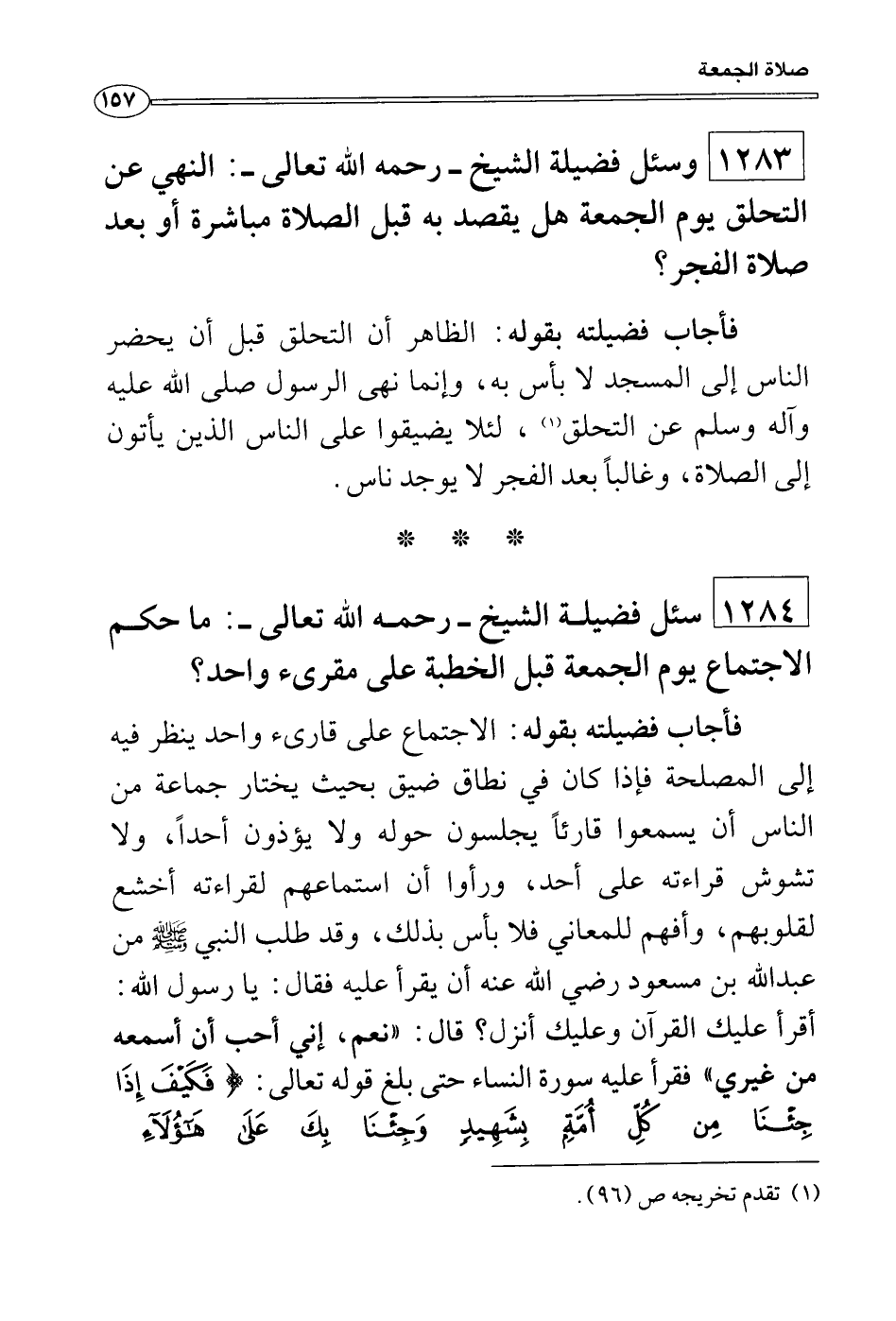 وسئل فضيلة الشيخ - رحمه الله تعالى -: النهي عن التحلق يوم الجمعة هل يقصد به قبل الصلاة مباشرة أو بعد صلاة الفجر؟