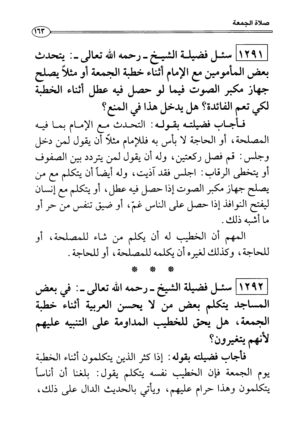 فأجاب فضيلته بقوله: التحدث مع الإمام بما فيه المصلحة، أو الحاجة لا بأس به فللإمام مثلاً أن يقول لمن دخل وجلس: قم فصل ركعتين، وله أن يقول لمن يتردد بين الصفوف أو يتخطى الرقاب: اجلس فقد آذيت، وله أيضاً أن يتكلم مع من يصلح جهاز مكبر الصوت إذا حصل فيه عطل، أو يتكلم مع إنسان ليفتح النوافذ إذا حصل على الناس غمّ، أو ضيق تنفس من حر أو ما أشبه ذلك.