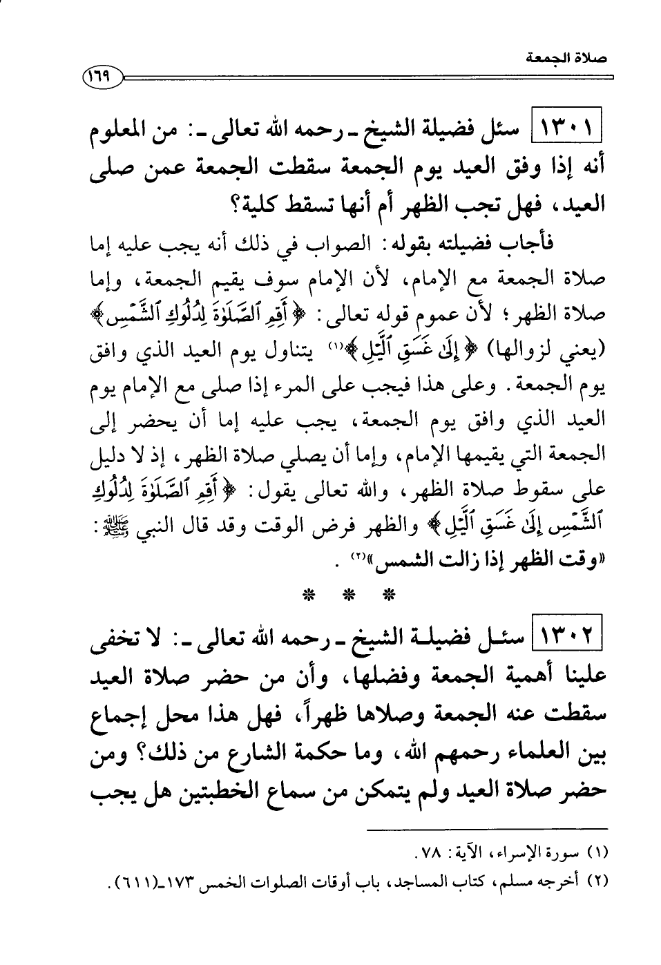 فأجاب فضيلته بقوله: الصواب في ذلك أنه يجب عليه إما صلاة الجمعة مع الإمام، لأن الإمام سوف يقيم الجمعة، وإما صلاة الظهر؛ لأن عموم قوله تعالى: {أَقِمِ الصلاةَ لِدُلُوكِ الشَّمْسِ إِلَى غَسَقِ الَّيْلِ وَقُرْءَانَ الْفَجْرِ إِنَّ قُرْءَانَ الْفَجْرِ كَانَ مَشْهُودًا} (يعني لزوالها) {إِلَى غَسَقِ الَّيْلِ وَقُرْءَانَ الْفَجْرِ إِنَّ قُرْءَانَ الْفَجْرِ كَانَ مَشْهُودًا} يتناول يوم العيد الذي وافق يوم الجمعة. وعلى هذا فيجب على المرء إذا صلى مع الإمام يوم العيد الذي وافق يوم الجمعة، يجب عليه إما أن يحضر إلى الجمعة التي يقيمها الإمام، وإما أن يصلي صلاة الظهر، إذ لا دليل على سقوط صلاة الظهر، والله تعالى يقول: {أَقِمِ الصلاةَ لِدُلُوكِ الشَّمْسِ إِلَى غَسَقِ الَّيْلِ وَقُرْءَانَ الْفَجْرِ إِنَّ قُرْءَانَ الْفَجْرِ كَانَ مَشْهُودًا} والظهر فرض الوقت وقد قال النبي صَلَّى اللَّهُ عَلَيْهِ وَسَلَّمَ: «وقت الظهر إذا زالت الشمس» .