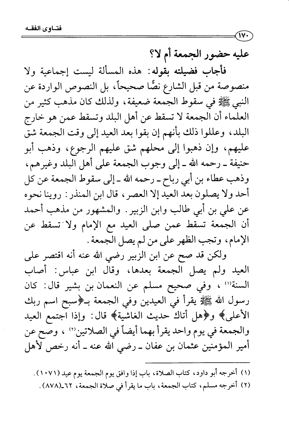 فأجاب فضيلته بقوله: هذه المسألة ليست إجماعية ولا منصوصة من قبل الشارع نصًّا صحيحاً، بل النصوص الواردة عن النبي صَلَّى اللَّهُ عَلَيْهِ وَسَلَّمَ في سقوط الجمعة ضعيفة، ولذلك كان مذهب كثير من العلماء أن الجمعة لا تسقط عن أهل البلد وتسقط عمن هو خارج البلد، وعللوا ذلك بأنهم إن بقوا بعد العيد إلى وقت الجمعة شق عليهم، وإن ذهبوا إلى محلهم شق عليهم الرجوع، وذهب أبو حنيفة رحمه الله إلى وجوب الجمعة على أهل البلد وغيرهم، وذهب عطاء بن أبي رباح رحمه الله إلى سقوط الجمعة عن كل أحد ولا يصلون بعد العيد إلا العصر، قال ابن المنذر: روينا نحوه عن علي بن أبي طالب وابن الزبير. والمشهور من مذهب أحمد أن الجمعة تسقط عمن صلى العيد مع الإمام ولا تسقط عن الإمام، وتجب الظهر على من لم يصل الجمعة.