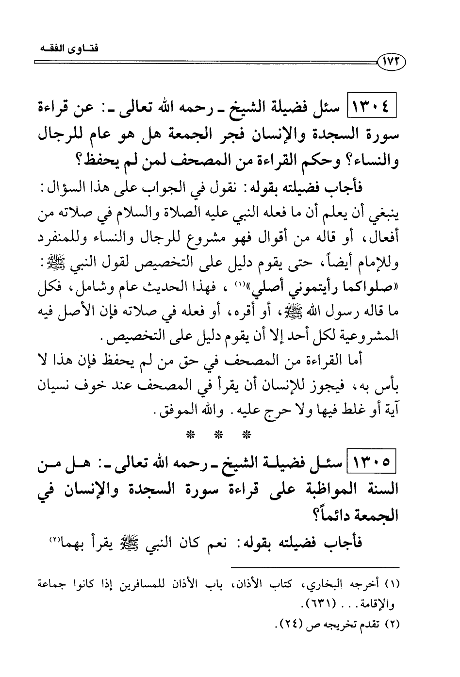 سئل فضيلة الشيخ - رحمه الله تعالى -: هل من السنة المواظبة على قراءة سورة السجدة والإنسان في الجمعة دائماً؟