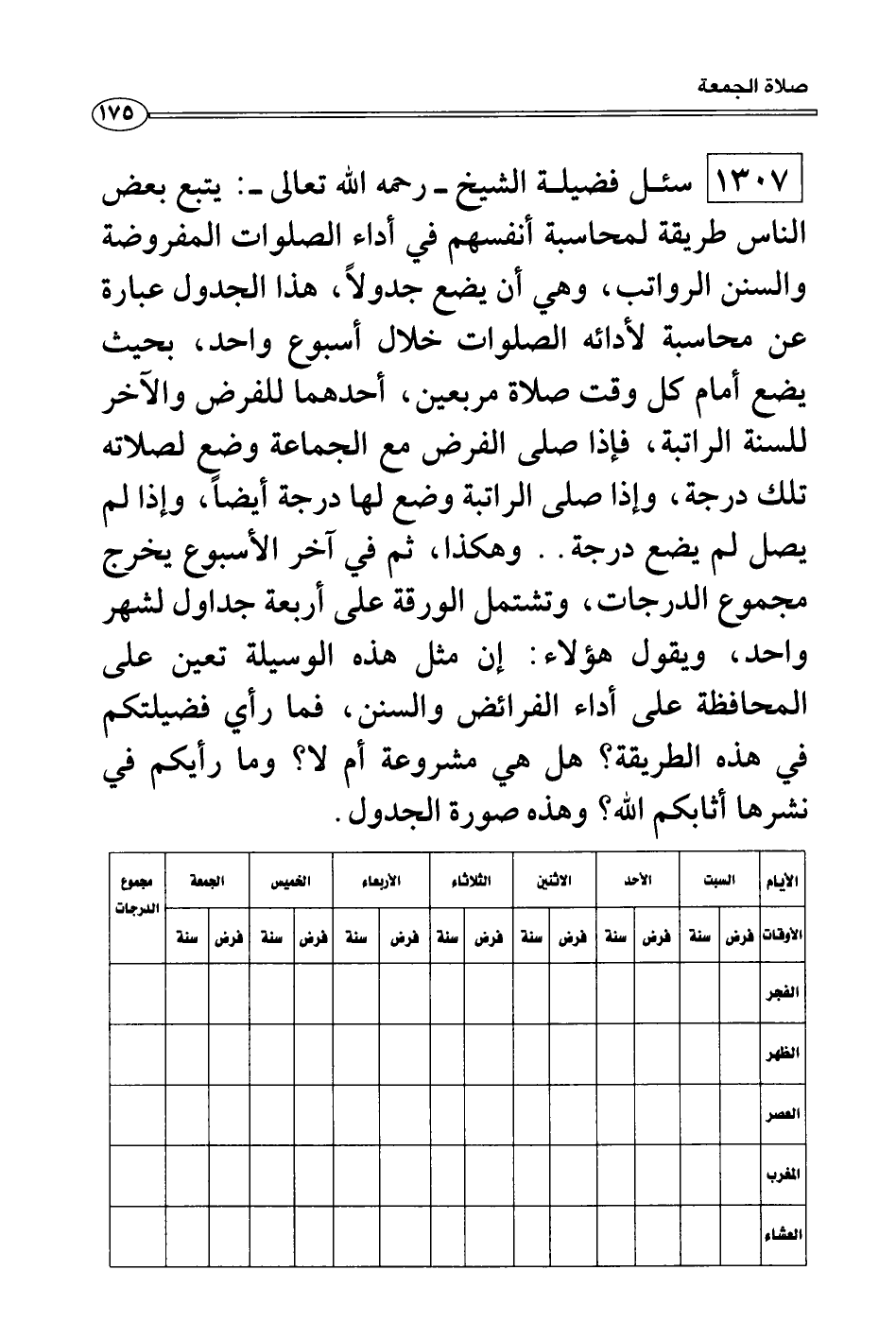 سئل فضيلة الشيخ - رحمه الله تعالى -: يتبع بعض الناس طريقة لمحاسبة أنفسهم في أداء الصلوات المفروضة والسنن الرواتب، وهي أن يضع جدولاً، هذا الجدول عبارة عن محاسبة لأدائه الصلوات خلال أسبوع واحد، بحيث يضع أمام كل وقت صلاة مربعين، أحدهما للفرض والآخر للسنة الراتبة، فإذا صلى الفرض مع الجماعة وضع لصلاته تلك درجة، وإذا صلى الراتبة وضع لها درجة أيضاً، وإذا لم يصل لم يضع درجة.. وهكذا، ثم في آخر الأسبوع يخرج مجموع الدرجات، وتشتمل الورقة على أربعة جداول لشهر واحد، ويقول هؤلاء: إن مثل هذه الوسيلة تعين على المحافظة على أداء الفرائض والسنن، فما رأي فضيلتكم في هذه الطريقة؟ هل هي مشروعة أم لا؟ وما رأيكم في نشرها أثابكم الله؟ وهذه صورة الجدول.